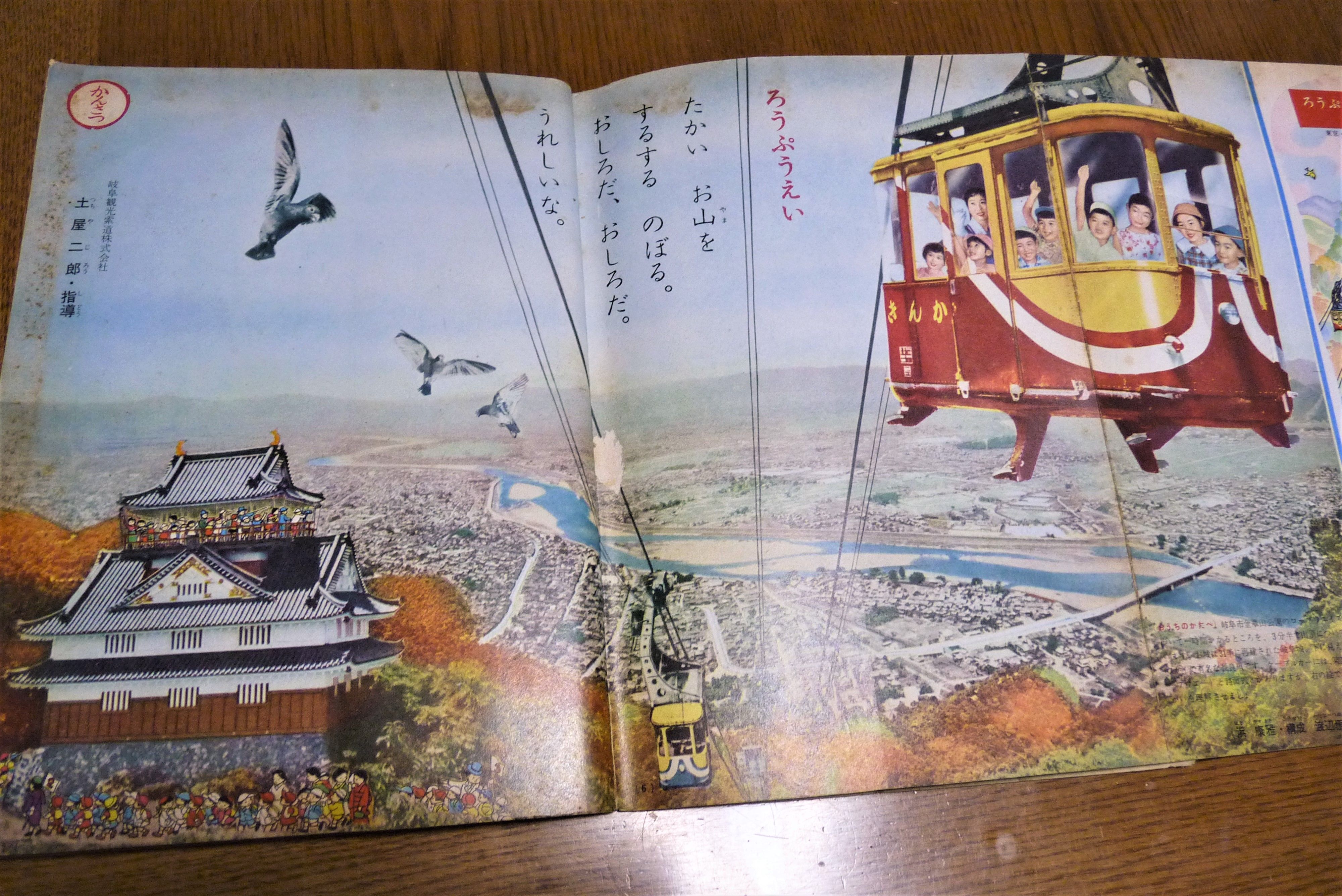 先日、所沢の古本市へ行ってきました。今回はロープウェイ関係の収穫はゼロかなと、半ばあきらめかけていた時、「小学一年生」が数冊あり、パラパラとめくっていたら、突然ロープウェイが出てきた。それがすぐに金華山ロープウェイの初代搬器だとわかりました。黄色と赤の独得のツートンカラー。写真に着色したような、絵にも見える感じで何ともレトロ感満載。見開き2ページと、ちょっとおまけのページもついています。発行日は昭和33年である。金華山の開業が昭和30年です。ページでは岐阜城がロープウェイの左側に描かれていて、これはウソですが、まあ子供向けの雑誌なので、ロープウェイの楽しさ、山頂に上ってそこでお城見学をする楽しさを表現するための手段だと言えましょう。