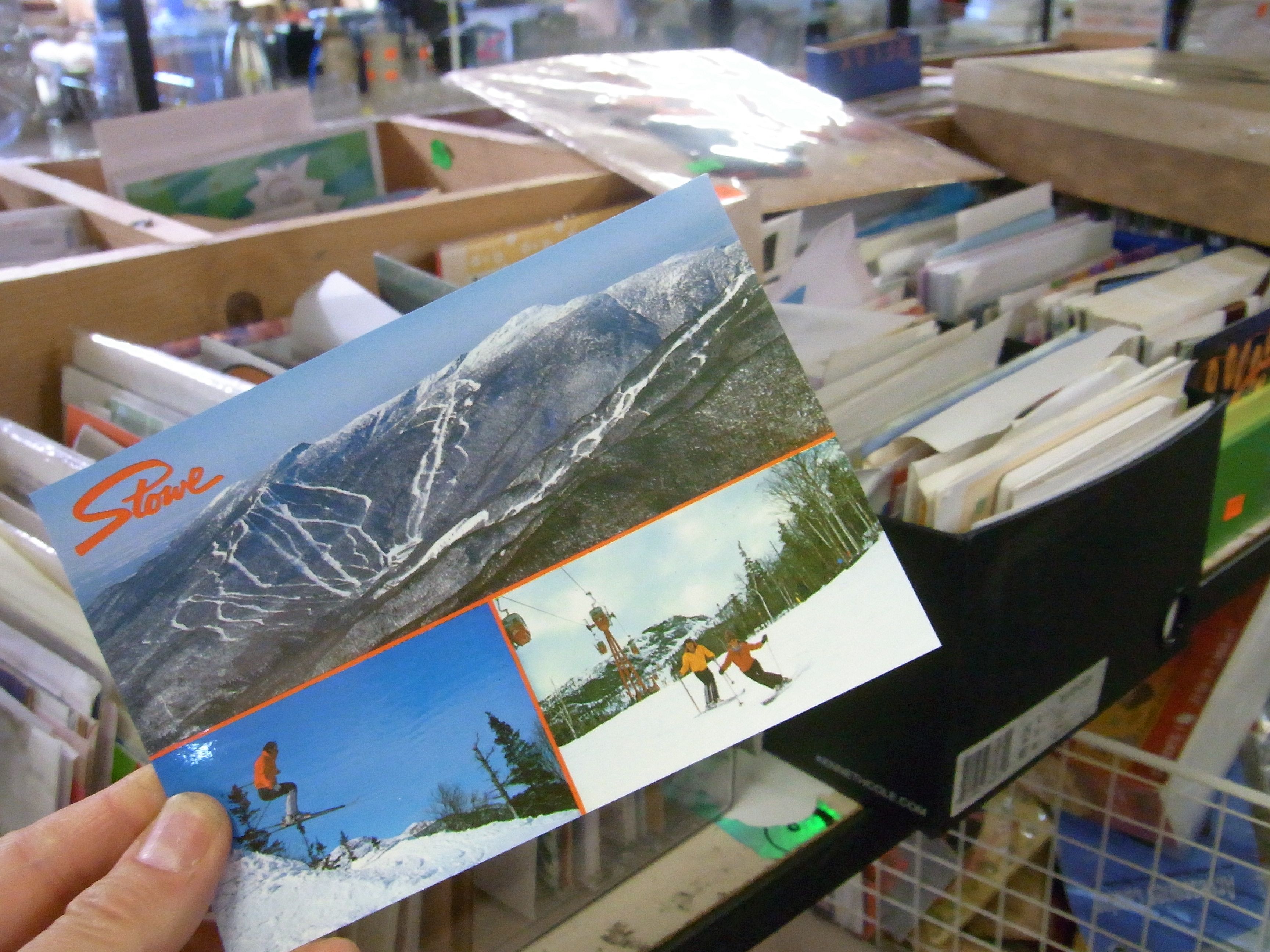 自分は今サンフランシスコに滞在しています。こっちに来るとThrift Shopというリサイクルショップみたいなお店によく足を運びます。いろんなガラクタを見ているだけでも楽しいのです。そこに行くと、何かロープウェイのモノをひとつでも見つけてやろうと目を光らせてみて回ります。絵葉書やカードが入った箱がいくつかあったので、全部漁ってみてみましたが、みつかったのはこ1枚だけ。バーモント州にあるStoweというスキーリゾート地の絵葉書に、小さくロープウェイが確認できます。今日の収穫はこれだけでした。(笑)このスキー場は今でも運営していて、ロープウェイはCWA製のゴンドラに架け替えられているようです。