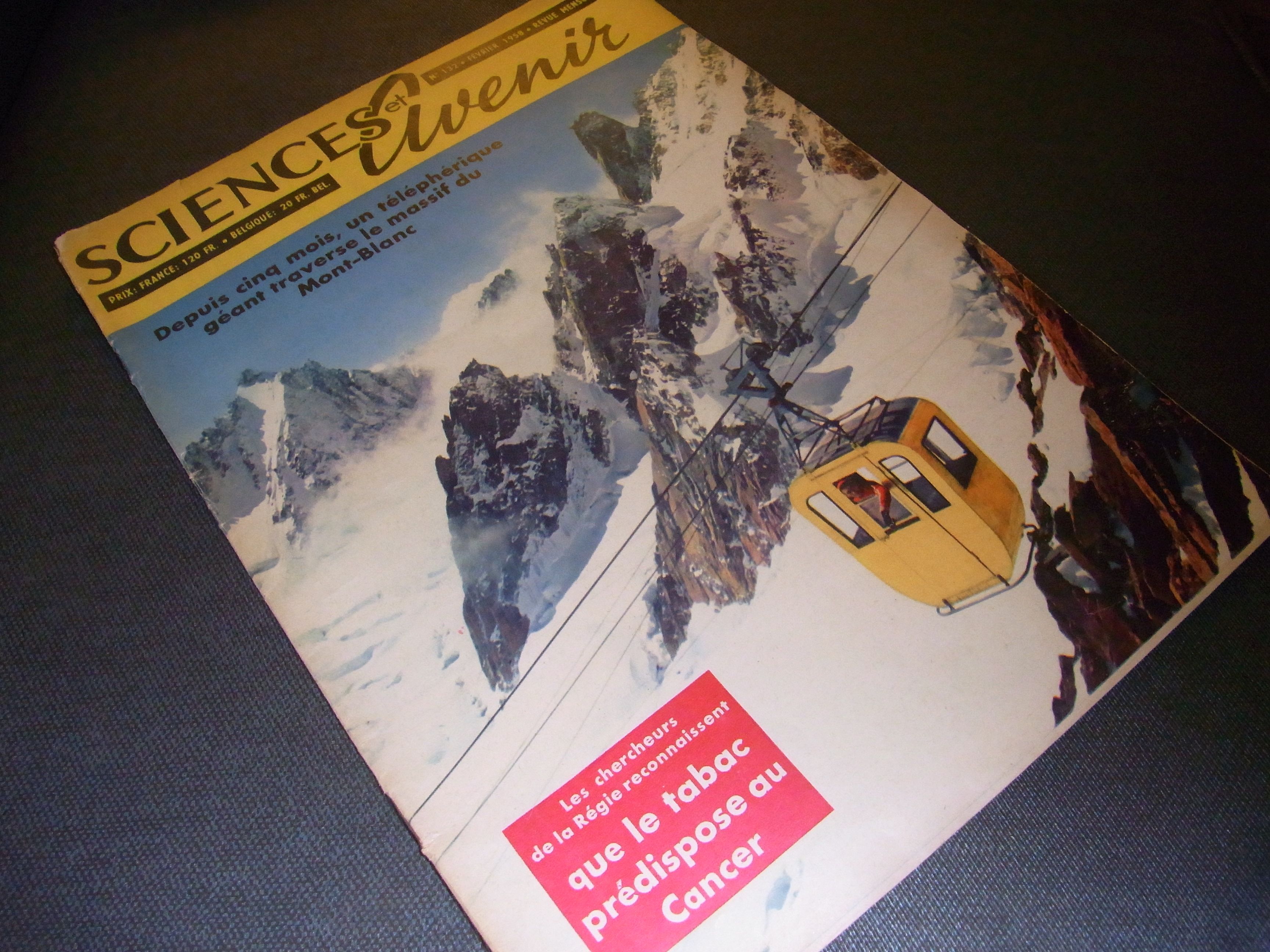 Ebayオークションをチェックしていたら古いフランスの雑誌を見つけて、表紙のデザインに惹かれたので買いました。調べたらSciences et Avenir(サイエンス・エ・アヴェニール)という科学雑誌で1947年創刊。現在も発売されているようです。これは1958年2月号で7ページに渡りロープウェイの記事が載っていました。フランス語だから読めないけど。