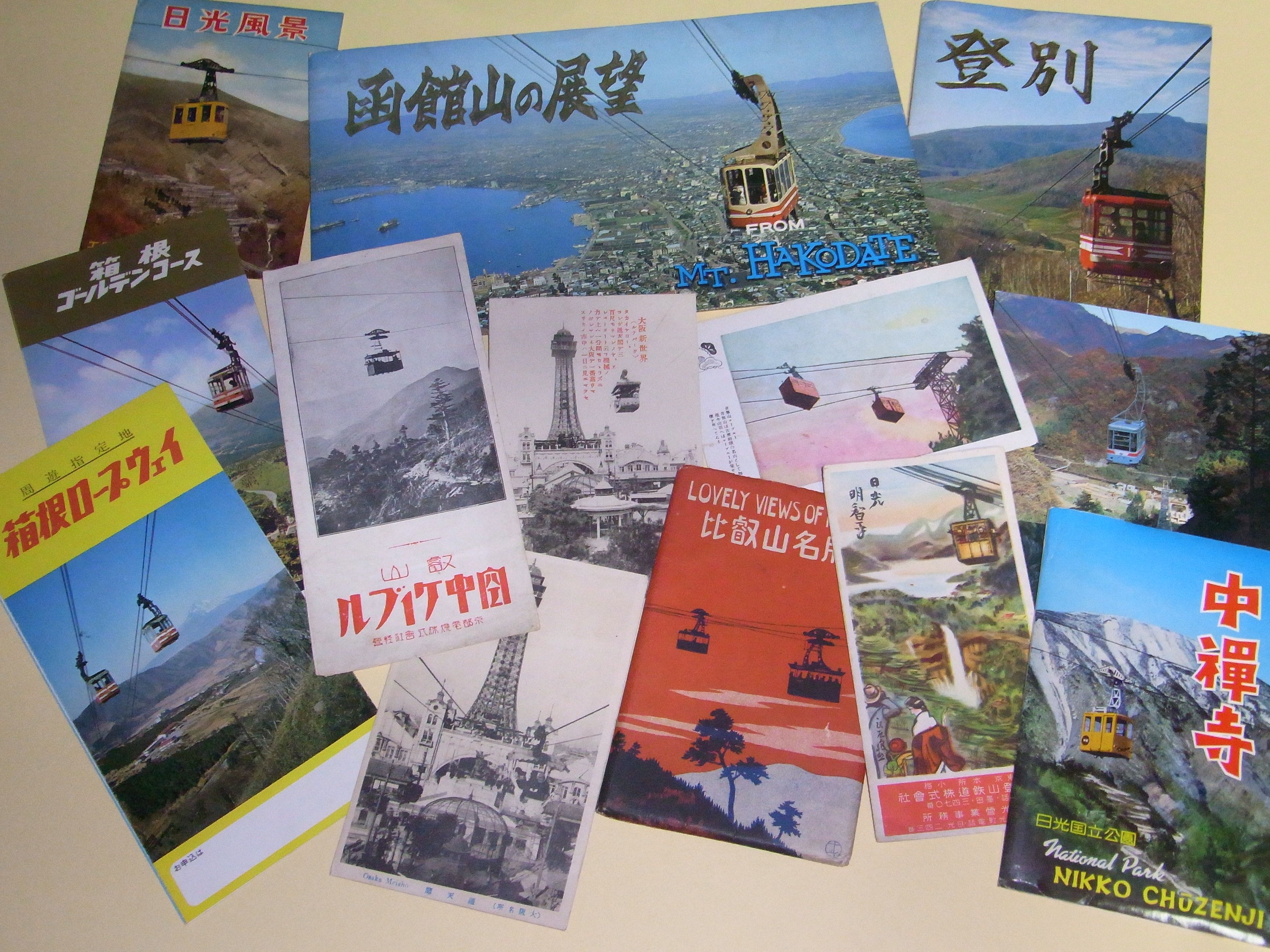大塚のスタジオで振付を考えていたら、知人からメールで、池袋で古本市をやっているという情報が入った。大塚からならすぐなので、そんじゃ帰りに寄ってみようと期待もせずに行ったら、まあ大収穫。言いかえれば思わぬ出費!函館山の大判絵葉書400円、登別の大判絵葉書300円、日光の絵葉書300円、昇仙峡の絵葉書300円、箱根ロープウェイのパンフ2つで500円、比叡ケーブルの戦前のパンフ500円、通天閣のロープウェイの絵葉書それぞれ300円×2枚、戦前の比叡山の絵葉書セット500円、明知平の戦前のパンフ500円、吉野ケーブルの戦前の絵葉書300円、中禅寺湖の絵葉書400円 総額4600円も使ってしまった。でも、この手の古本市って、普通はロープウェイ関連のモノなんて、絵葉書の1枚も見つかればいい方なので、久しぶりにワクワクする買い物になりました。