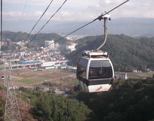 今度は循環式のロープウェイに乗ってましょう。ゴンドラがたくさんぶら下がっていて一定方向に回っているやつですね。ゴンドラリフトとも言われたりします。もし乗りに行かれたら、やはり上のロープを観察してみてください。ゴンドラを支える支索とそれをひっぱるえい索があるはずです。循環式とちがうのは、えい索が常に一定方向に動いています。駅を出発したゴンドラはそのえい索をつかんで動きます。到着するとそのえい索を放して止まります。もしロープが一本しかみあたらないときは、それは「支えい索」とよばれて、ゴンドラを吊るす役目と引っ張る役目の両方を兼ねています。なので滑車がありません。下の画像はその一例、かつらぎ山ロープウェイです。そのほかに最近はフニテルという2本の支えい索で進む最新式のロープウェイもあります。箱根ロープウェイがその代表です。