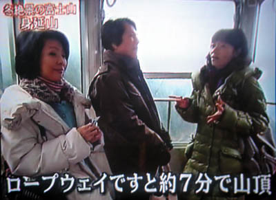 いつもロープウェイの場面を録画するために旅行番組をチェックしているのですが、ここのところずっとハズレでした。でも昨日の「いい旅・夢気分」にひさしぶりにロープウェイが登場!「冬の絶景 富士七景を目指す 山中湖~甲府」というタイトルで国広富之さん、市毛良枝さん、田島令子さんが旅人でした。富士山の絶景を求めて身延へ。こうなれば間違いなく身延山ロープウェイが出てくると確信。国広さんが「ロープウェイで行きましょう」と言うと「助かりました」と田島さん。でも登山が趣味の市毛さんは「ちょっと残念」とおっしゃる。もしここで歩いて登られたら僕ががっかりでした。3人がキャビンに乗り込む様子があり、乗務員さんが干し梅を配っていた。同じ物が山頂売店で売っているんですね。自分は梅が嫌いなので食べませんでしたが、普通のお客さんには好評らしい。「このロープウェイは店員45名、奥の院までの参道を下から歩いて登りますと片道2時間半の道のりも、このロープウェイですと約7分で山頂に到着いたします。」とガイドに耳をかたむける3人。「高低差763メートルをロープウェイは一気に登ります」というナレーションに山頂に上がるキャビンが映りました。あいにく視界が悪く3人は富士山を見ることができませんでした。