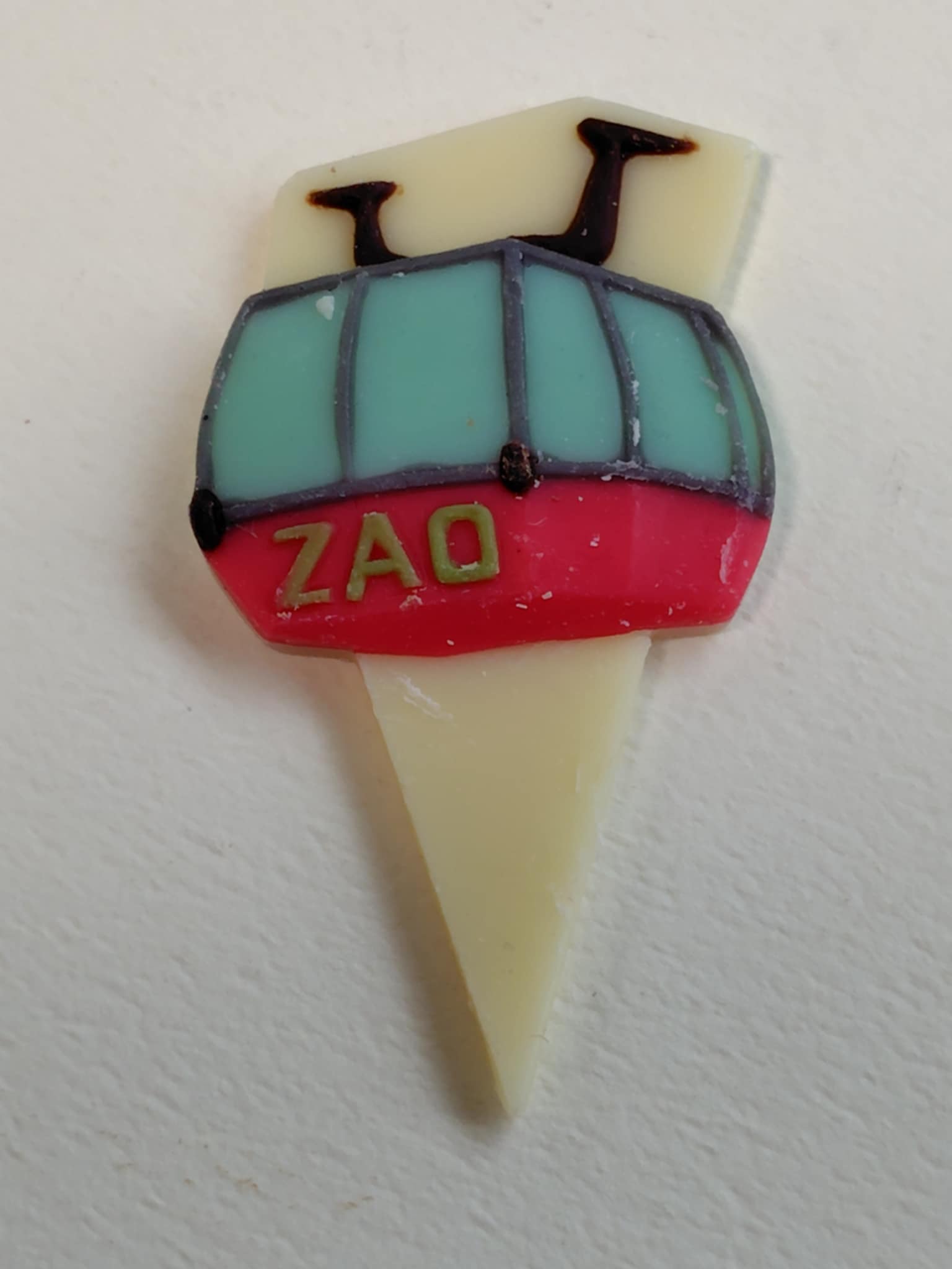 これがロープウェイチョコです。ここまでゴンドラがデザインされていると欲しくなります。ホワイトチョコレートをベースに着色されています。縦4.5cmx横2.5cmぐらいです。これは食べずに保存します。