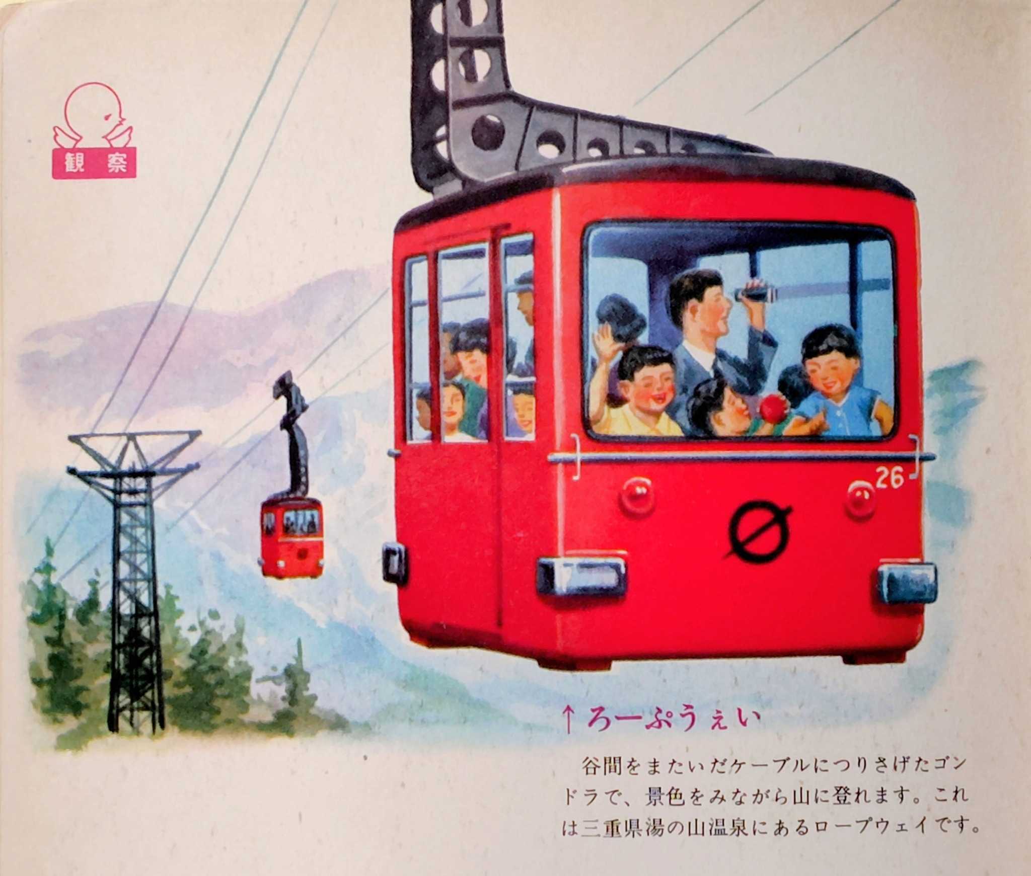 これは小学館の「めばえ」昭和42年7月号の中のページです。「観察」というコーナーで乗物が紹介されています。子供向けの古い乗物絵本を集めていると、昭和30年代頃までは、見開き2ページでロープウェイが大きく扱われているのですが、しばらくして物珍しさがなくなってくると、モノレールやケーブルカーと一緒に「変わり種の乗物」扱いで1ページの中に描かれていたりします。このページもそうですが、水中翼船やヘリコプターなどと一緒になっているのが珍しいパターンです。