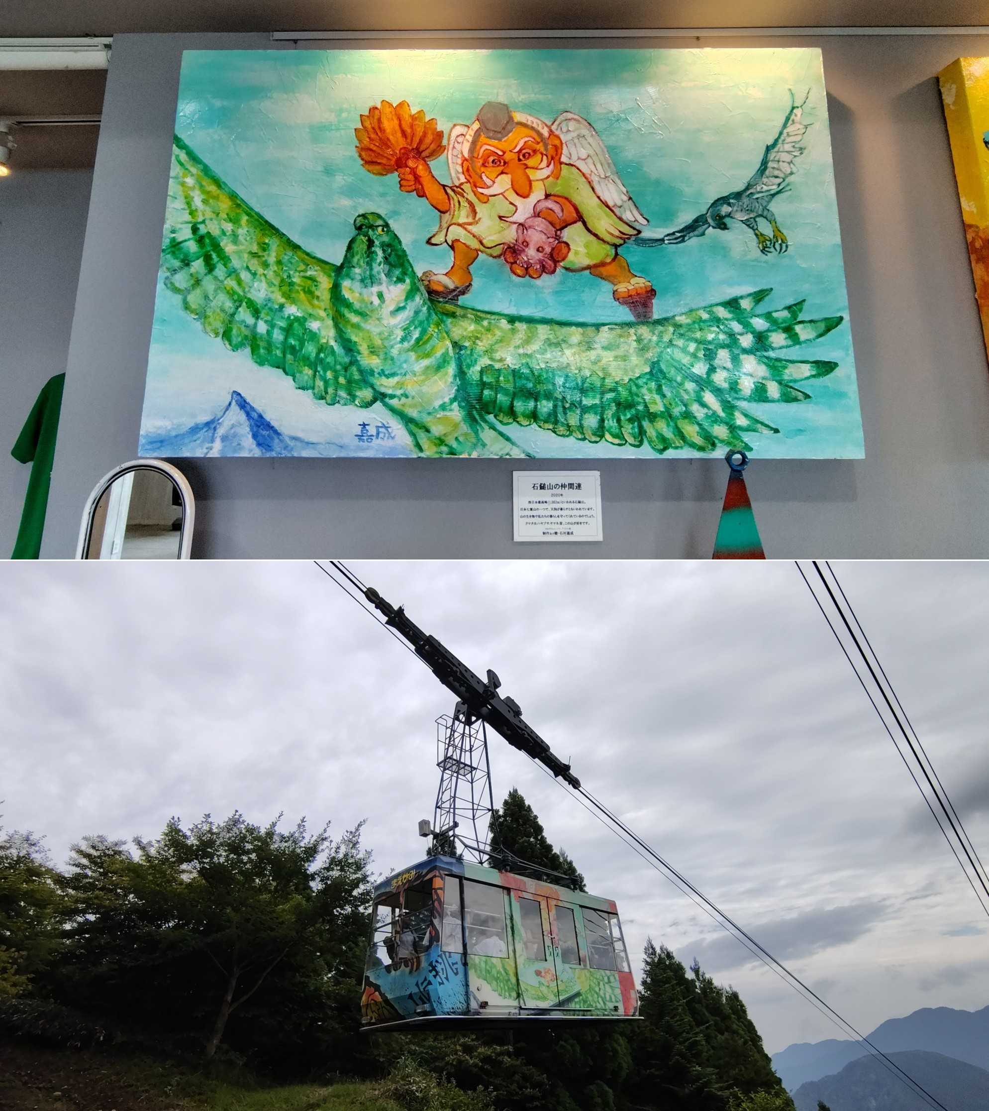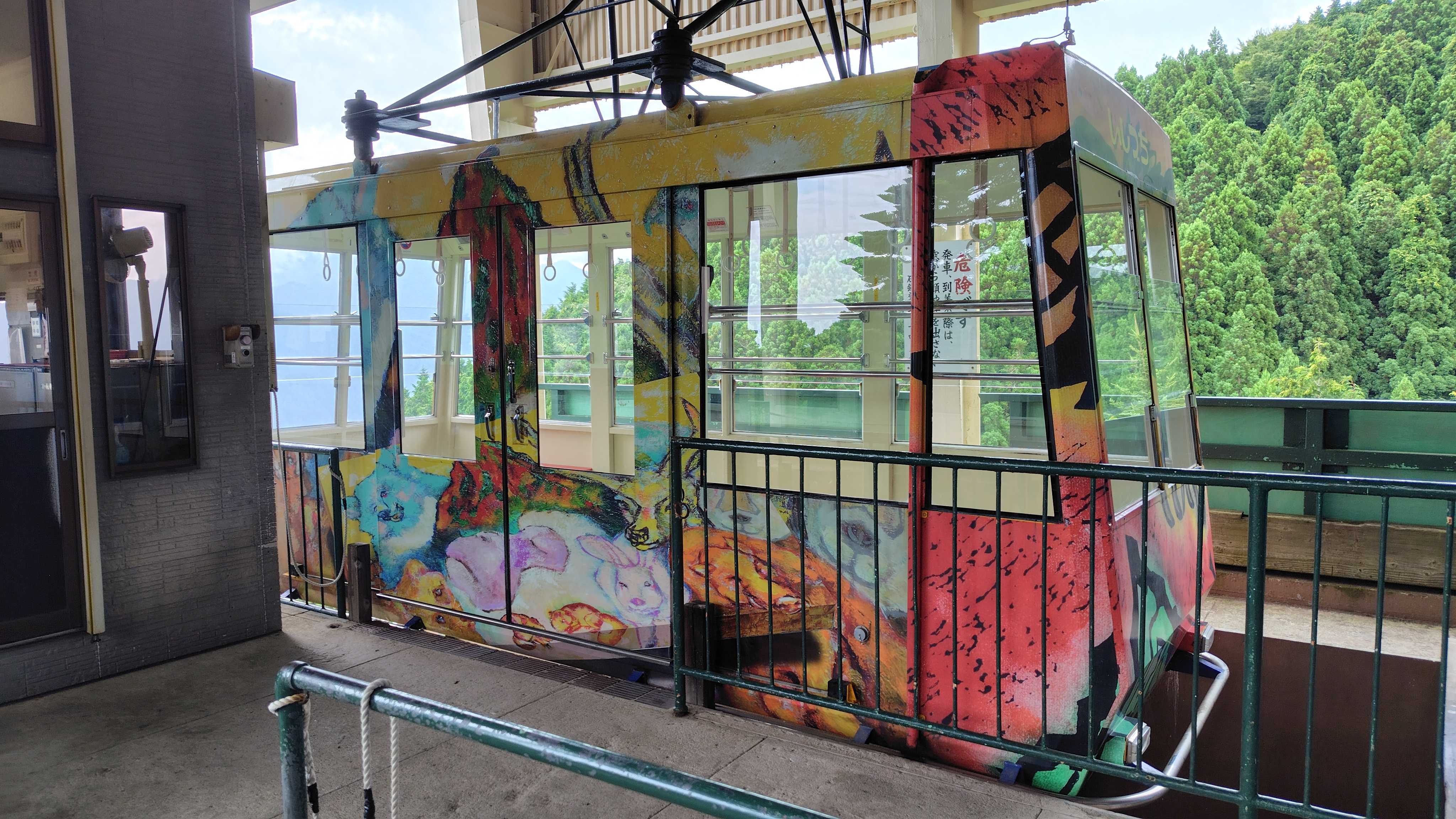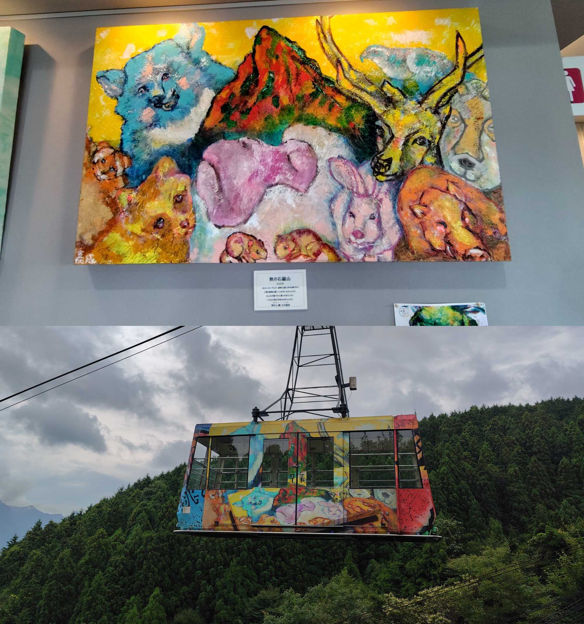 さて、搬器のデザインですが、来る前にホームページで見た時、なんか子供の落書きのようなゴチャゴチャした色彩のデザインで「なんじゃこりゃ!」と思いました。その事を従業員さんにうかがったら、愛媛県新居浜市出身の画家、版画家の石村嘉成氏の絵が元になっていることが判明。それをさらにコラージュしていたからゴチャゴチャしたイメージがしたんですね。1号車の「いしづち」は「秋の石鎚山」という作品から。