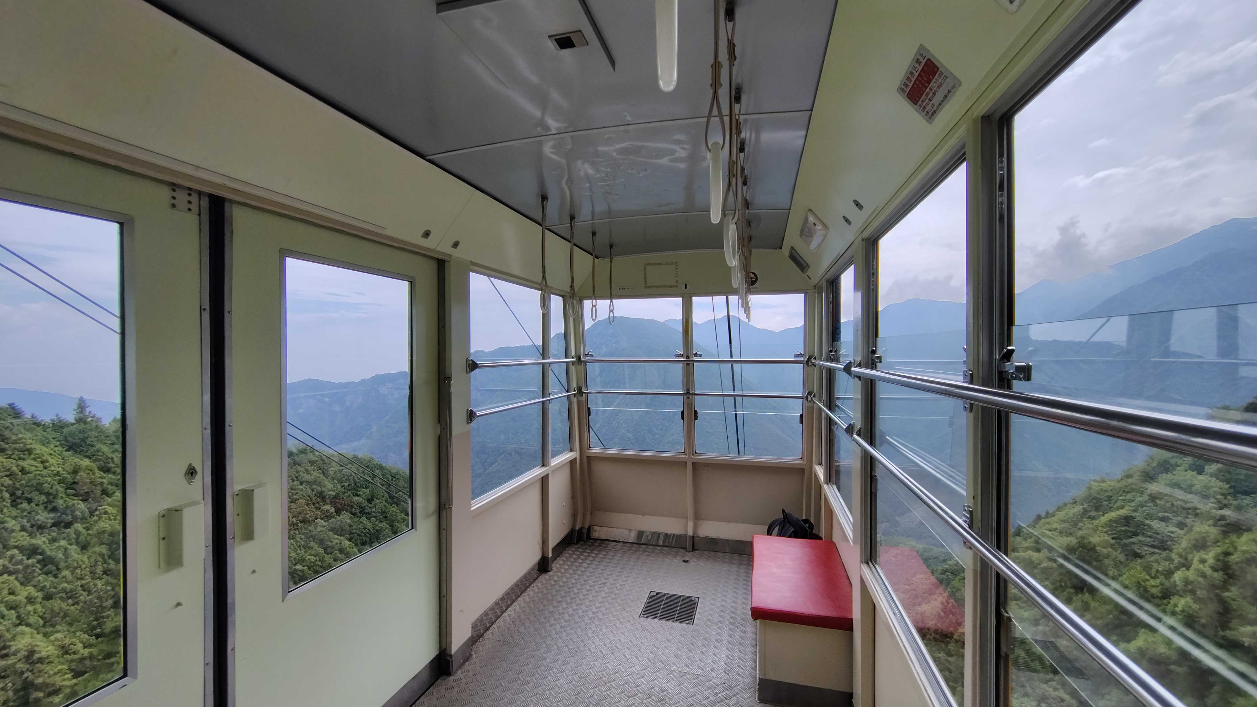 片道7分半なので、3分ちょっとで交差地点に。勾配もかなりあるので、反対の搬器は見上げるような感じでした。