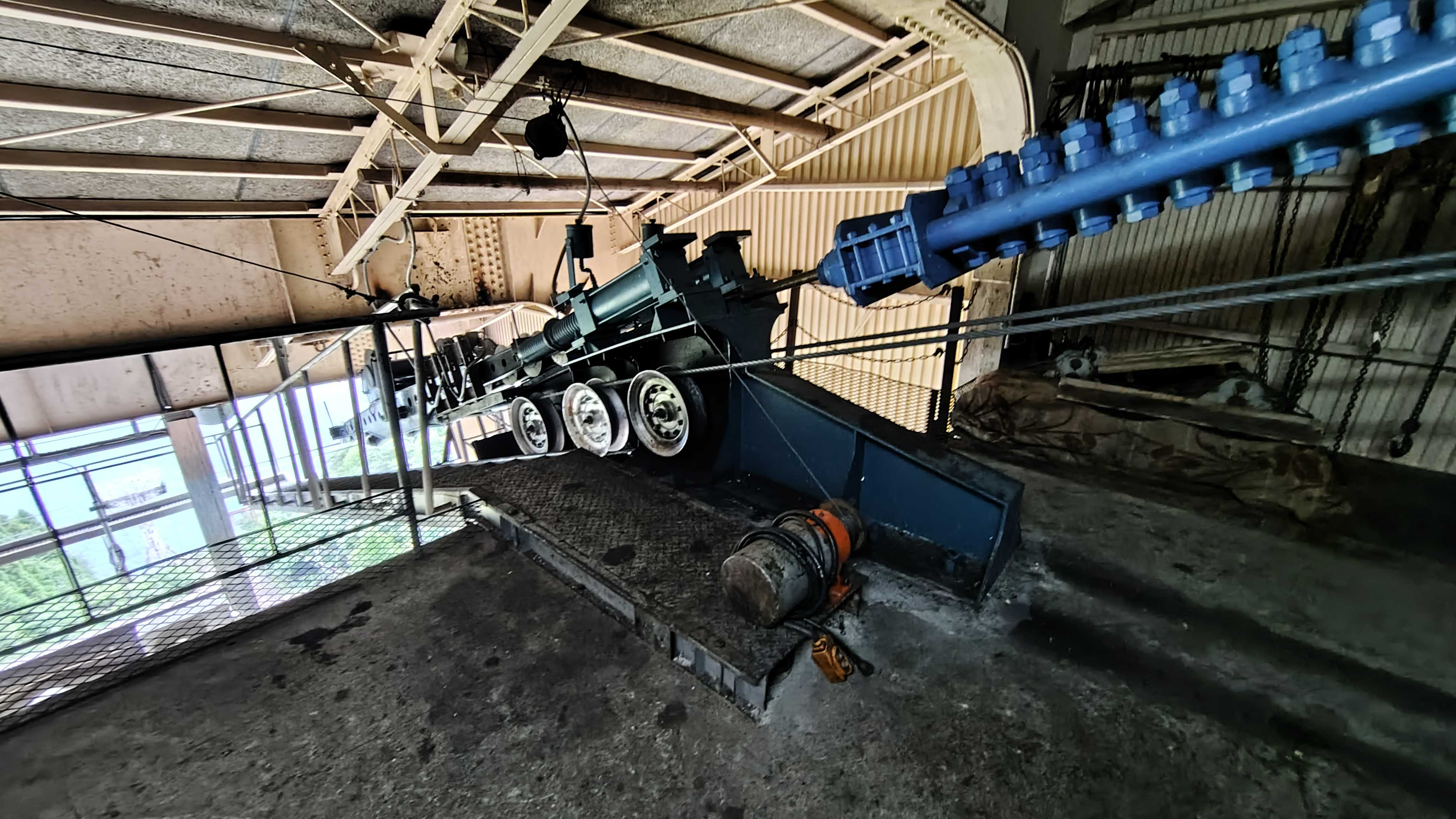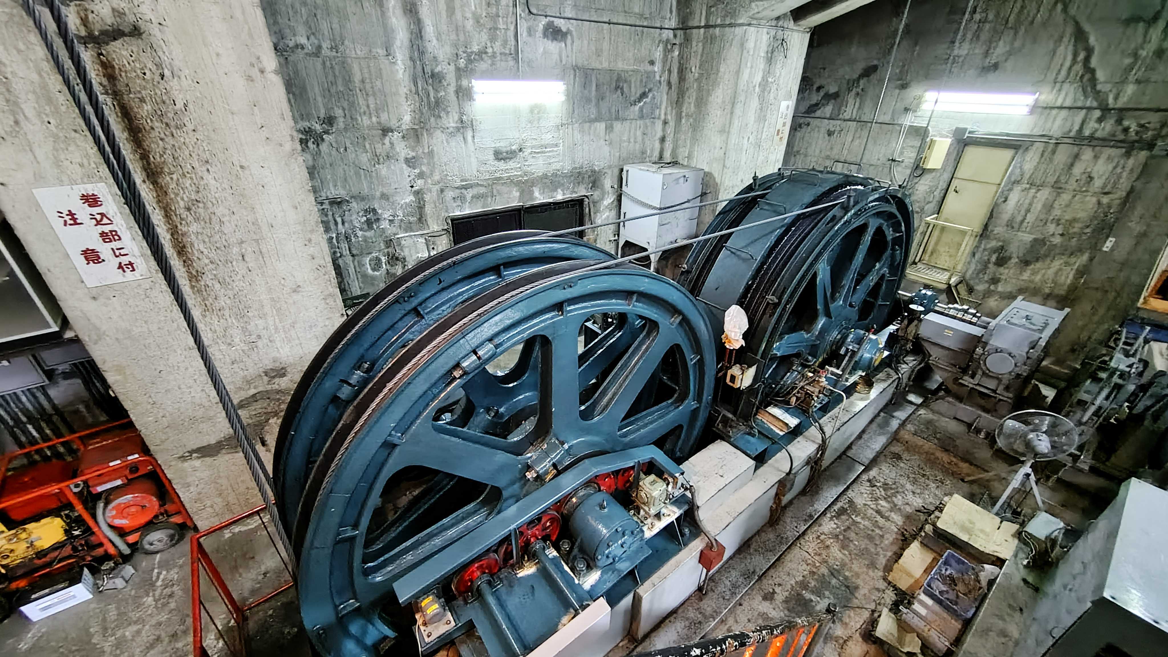 運転手さんにいろいろと質問していたら、次の改札までのわずかな時間に機械室を見学させてもらえました。丈夫そうな滑車が頼もしいです。