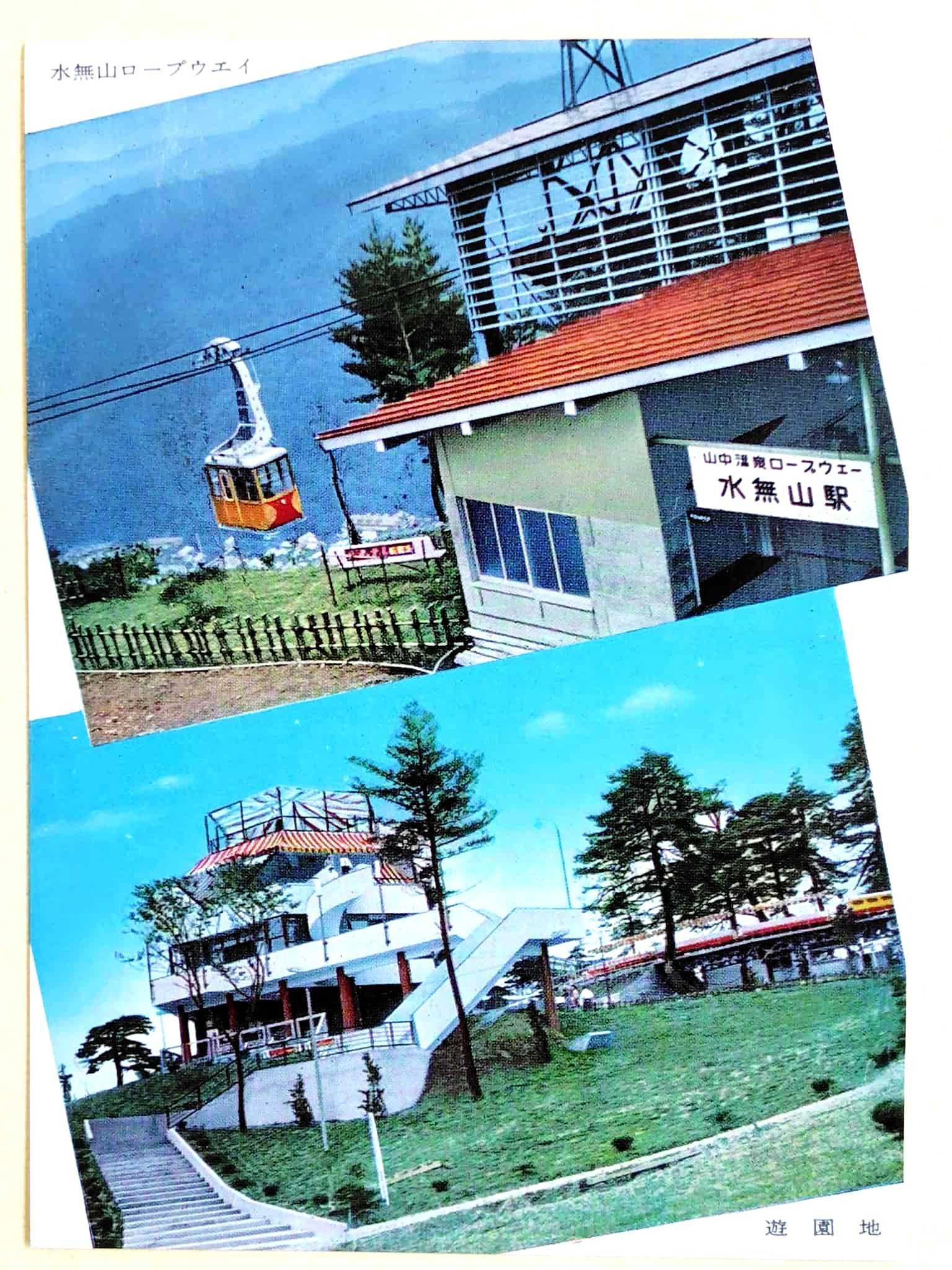山中温泉の絵葉書のセット。観光の目玉としてロープウェイが出来たことを誇らしげに思っているのが表紙から伝わってきます。1959年開業なので、まさにロープウェイ建設ラッシュの頃です。