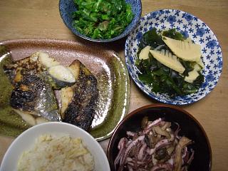 初物 たけのこご飯 おあげさんといっしょに炊きましたさわらの味噌漬け さわらが安くてうまいイカゲソときのこのニンニク炒め イカゲソ大盛り100円ラッキーふきたち菜のおひたし ふきたち菜は母が栽培していたのをゆでました 茎が甘くてやわらかくおいしい菜っ葉でしたたけのことワカメのたいたん 友達が海からワカメを取ってきてくれました 新鮮でプリプリ ご馳走です春の季節もの おいしくいただきましたこれで 腰痛が治ればいいんだけど そんなわっきゃないわね今日は接骨院で電気とマッサージ 湿布腰痛はなかなか治りません あ~ 若さがよみがえらない...(--)...