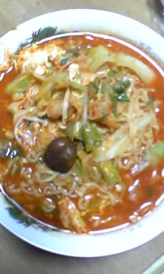 インスタントだけど 野菜 キノコ キムチ たっぷり入れて 豪華激辛ラ-メン誕生! 今夜はこれだけだよん〓