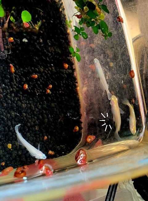 白めだか2人男の子とアルビノ少しラメの女の子2人。そしてアルビノとアルビノの子供1人の計5人です。