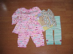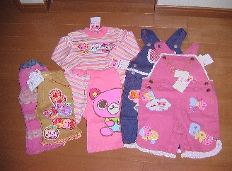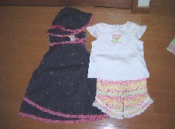 ちょうちょシリーズとてんとう虫さんのJSKの復活に乗せられて注文した分です。今回は、完全にコーディネート買いです。 てんとう虫さんのJSK+帽子(12-18m)と、FPのTシャツ+カプリ(上12-18m、下6-12m)、ちょうちょさんの白カプリ・チェックの上下・Tシャツ(12-18m)です。ちょうちょさんの白カプリ、6-12mも購入しているのですが、2枚重ねて見たところ、ウエストはほとんど変わらず、12-18mの丈が長いだけだったので、6-12mは試着もせずオクに出すことにしました。(3月の旅行が終わって落ち着いてからの予定。)まだ6-12mでいいやと思っていたのに、意外な感じ。12-18mも買っててよかったかも。とは言え、12-18mの丈は、どちらかというとフルレングスの方が近いですが。。。ちょうちょのカプリ12-18mとFPのカプリ6-12mは、あまりサイズ変わらない気がします。FPがきっと大きめなんだと思いますが。トップス類は全部12-18mにしたけれど、やはり今すぐ1枚で着せると大きかったです。今回は枚数も少ないので全部試着してもらったのだけれど、下にボディを着た状態ならそんなに大きく感じないのですが、1枚だと襟元が開く感じ。娘は、ちょうちょさんシリーズを着せると、ちょうちょが気になるらしく、くわえてひっぱるので、ますます開いてしまいます^^;夏にはおとなしく着てくれるかしら~。ボトムは、ウエストは大きい物の、カプリなので丈は踏む心配はありません。チェックの分のボトムは、オムツのせいか12-18mでもなんだかパンパン。娘のお尻は小さいのだけれど、パンツオムツMのせいで意外と大きなお尻になっているのね。うっかり3-6mなんかねらわなくて、本当によかった~。座るとスカートのように見えてとってもかわいかったです。今回は、比較的枚数少ないですが、50ドルのクーポンもgetしたことだし、結構満足感があります。これでねらい通り、関税が来なければ、すごくよい買い物だったと思えるのだけれど。関税きませんように~。