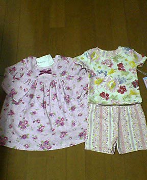 先日到着したティファニーのパジャマとセール品のワンピースです。 セール品は、本当は2ピースが本命だったのですが、残念ながら発送前に品切れでしたワンピースは、大花の12mを持っていて、秋にはサイズアウトだなあと思っていたので、安くなっているしと思って18mを購入。Tドレスは、レギンスとあわせて部屋着にしているので、何枚あってもよさそうです。そして、ティファニーのパジャマですが、お話に聞いていたとおりかわいい!パジャマとして着せるだけではもったいないです。保育園でも活用したいと思っています。12-18mでも小さいかな?と思うくらい細い感じがしましたが、着せてみるとそうでもなくて、ちょうどよさげでした。18-24mでも夏なら着られたかなあという気はするけれど、ジャストになりそうなのでよしとします。大満足な買い物でしたみなさまにはご心配おかけしましたが、もう2人とも熱も下がり、だいぶ落ち着くことができました。あとはせきが出るのが気になるところですが、もう大丈夫だと思います。月曜日から仕事と保育園でがんばらなくては。ようやく落ち着いてお買い物もできそうです