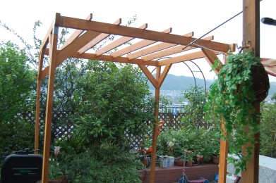 先日完成したパーゴラ!設置場所は、お部屋からテラスへの扉のすぐそば。雑誌やカタログでよくみる憧れのガーデンルームをイメージして、リビングの延長のスペースとして日よけも兼ねて使うことにしました。ウッドデッキは、今のマンションへお引越ししてきた6年半前に敷き詰めていたのですが、お安いタイプを選んでしまい、たった3年程でボロボロに木が腐っちゃって。。安物買いのなんとやらで、処分に一苦労でしたさくらが1歳前、さくらがお昼寝の時間に少しずつ処分しましたが、ちょうど病気発覚するころのこと。。今思うと、体調も今ひとつだったのでしんどかったんでしょうね。でも、同じ時期に購入したおばあちゃんのお家のウッドデッキは、我が家が選んだものとは違い、した半分傷みにくい材質でできていることと、毎年しっかりメンテナンスでペンキを塗っていたこともあって、我が家の倍の6年も使っています。でも、こんどはもっと耐久性のある人工木のウッドデッキに買い換えるということで、まだ使えそうな今までのウッドデッキをお下がりでいただいたのです^^パーゴラの完成の後、2重にしっかりペンキ塗りもしたのできれいになりましたよ!お日様の光を浴びて、風を感じ、鳥のさえずりを聞き、お花を見て、バラの香りで五感が大満足♪ますます私の癒し空間として活用できそうですこれから、大好きなバラさんが咲く季節は、しあわせな季節です♪私のモットーは、生きていることに感謝して、毎日を思い切り楽しむこと 人生は一度きりですからね!次は、何をしようかな?素敵なガーデン雑誌を眺めながら、私の空想は止まりません。バラが咲いたら、お友達もご招待したいなパパが自宅療養中だったので、お友達をご招待というのは去年の5月から、なかったのでさくらのお友達も「さくらちゃんちへ行きたい~!」って言ってくれていたそう。またぜひ遊びにきてねまめに連絡を取らない私で、反省。ずいぶん久しいお友達にも連絡を取ってみなくちゃでも、さくらったらパーゴラの足を抱きかかえて、「くさってる~!!アハハハハ・・」って、何度も叫ぶんですまさか、くさってなんかないですよ! どこでもすぐに「となりのトトロ」のメイちゃんになりきっちゃうさくらなのです素敵なお家にパーゴラがありましたよね。。遅れ遅れのの更新になっちゃってますね。では今日は子育てサークル! 行ってきま~す♪ベランダを楽しむお店 憧れです♪にほんブログ村応援いただけるとうれしいです♪ありがとうございます(*^-^*)