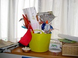 スウが入園して2ヶ月半強。園から持って帰るガラクタ工作の量がすごいことになっていますみんなで一緒に作る時もあるけど、ほとんどが自由遊びの際に、制作コーナーで勝手に作ってくるもの。だから、毎日のように何かを作って持ち帰る子もいれば、全然興味を示さない子もいるようで。私がこの園を気に入った理由の一つが、制作コーナーや自由遊びの充実。だから、スウがそれを楽しんでくれてるのは嬉しいのだけど、置き場所に困るよ・・・。もうバケツ一杯溢れてるし。これからもどんどん増えそうだし。ルナが壊しちゃうから、手が届かない場所=一番良い場所をガラクタ工作たちに占領されてます。↑出窓がこんな状態に・・・ 小物や平面の物はともかく、立体は困る~。この他にも、園でお預かりしてる物もあるだろうから、年度末はすごそう・・・。夫は、忘れてそうなのから捨てちゃえと言うけど、結構覚えていて、時々バケツをあさって、「○○はどこ~」なんてやってるし、作ったもので遊んだりもしてるから、捨てるのも可哀想だしね。それに、困ると言いつつ、何も持ってこない日が続くと、園で何してるんだろうな~と心配になったりも。とりあえず、子供部屋という名の荷物置き場に、少しづつ移動を計画中。私自身が、工作、というか自分で考えて何か作るってすごく苦手だから、娘がそういうのに積極的に取り組んでるのを見ると、頼もしいです家では「勿体ない!」と使わせないゴムのガムテープも、園では惜しみなく使わせてくれてるみたい。ありがたい↑お散歩の友の双眼鏡使ってるのは万能バケツのタブトラッグス便利な収納バケツ♪Tubtrugs(タブトラッグス) Sサイズこれ、可愛いし使い勝手も良くて、各サイズ家にあります♪