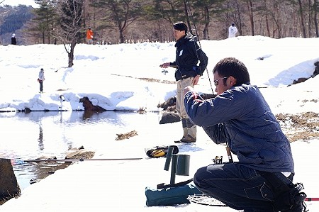 ■第15回AFA釣り大会■秋保フィッシングエリアにて ☆3月16日☆撮影:PENTAX OptioW20 ココニョロでの2投目での魚はばれましたが、3投目はキャッチ成功です。そこで余裕のある振りをして、2匹目のニジマスの記念撮影をしました。ブログに載せるには同じ色では見栄えが悪いと考え、ココニョロのカラーを変更しました。しかし、余計なことをしたようです。このカラーがベストなのでした。←クリックしていただけると嬉しいです。撮影:SIGMA DP1 その後、2ブロックでココニョロは魚を掛けてくれましたが、小生の腕が、それに応えられませんでした。敗者復活の早掛け戦にも破れ、小生の一日は終わりとなりました。決勝戦進出者が集まり決勝戦のルールの説明が行われています。ここから小生には退屈な1時間30分となったのでした。1人だけ帰るのも気が引けます。しばらくは釣りの見学しかないのです。(続く) and/or ←クリックしていただけると嬉しいです。今日は仕事が休みです。さて、どうするかな?■第30回オーパー!ルアーコンテスト開催 ⇒ 4月6日(日)9:00~11:00