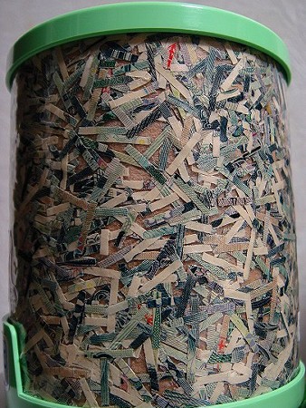 撮影:SONY Cyber-shot DSC-T30 息子が日本銀行支店の見学に行って、面白いものをもらってきました、何の変哲もない箱に、紙幣の裁断片を貼り付けた貯金箱なのです。紙幣の印刷じゃなくて、裁断片でも本物の紙幣が貼り付けてあるところがミソですね。再利用のコストがどうのこうのと言うのは野暮。忘れられない記念品です。 and/or ←クリックしていただけると嬉しいです。