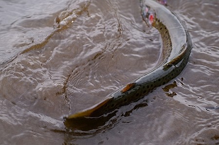■ブルックトラウト■管理釣り場「鱒の家」にて ☆3月2日☆撮影:PENTAX OptioW20 「鱒の家」のポンドの流れ込みです。濡れても使える防水カメラOptioW20ならではの、水面ぎりぎりからのアングルで撮りました。パンフォーカスモードでしたので、手前の水面に奇妙なボケが生じて、まるでトイカメラで撮ったかのような雰囲気が出ていると思いましたが、いかがでしょうか。 ←クリックしていただけると嬉しいです。撮影:PENTAX OptioW20 いつも使っているプラグで反応がなくなったため、反則ぎりぎりルアー、バリバスのスティックベイトのただ引きをしてみました。そして8匹目を釣りました。このルアーで釣ったのは5~6年ぶりかな?去年、白河フォレストで爆釣していた人を見て、スティック・ルアーのXスティックを買い足しておりました。同類の反則ぎりぎりルアーの、ぐるぐるXなんかは、数色持っていますが、これは現在も完全な宝の持ち腐れ状態です。こういった棒状のルアーはキャストしにくいので、遠投する必要のない狭いエリアでしか威力を試せません(白河で釣っていた人は、スティック・ルアーの達人のようですから特別ですね)。管理釣り場の魚は(バスはどうなんでしょう)、フォーリングや、ただ引きで、長い棒状ルアーの動きに興味を示し、釣れるらしいのです。釣りの腕には関係ない?釣れ過ぎると恐れをなして? スティック・ルアーを使用禁止にしている管理釣り場があります。「オーパー!」でも使用禁止ですが、ここでは使っても釣れとは思えません。あそこは腕(いや、それと運)で釣る所なのですよ! (続く)←クリックしていただけると嬉しいです。■第30回オーパー!ルアーコンテスト開催 ⇒ 4月6日(日)9:00~11:00 ■スティックベイト ■Xスティック No.3 オリーブ ■ぐるぐるX 1.2g #20:ダークオリーブ