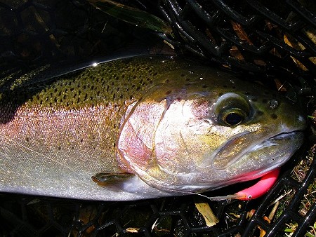 ■鱒の家、ココニョロ■管理釣り場「鱒の家」にて ☆3月2日☆1人だけの釣りなのに、何でそんなに楽しく盛り上がった話になっているのでしょうね。小生は1人遊びができる根暗なのかな? でも話は、これで最後です。撮影:PENTAX OptioW20 釣り終了時間まで10分となりました。釣れても釣れなくても、最後は一番信頼しているルアーで終わるのが小生の流儀です。管理釣り場「鱒の家」では、蛍光ピンクのココニョロが小生の定番なのです。信頼は裏切られることなく、ココニョロで10匹目です。←クリックしていただけると嬉しいです。撮影:PENTAX OptioW20 すれ切った時間帯でも、ココニョロは魚の食い気にスイッチを入れるらしいのです。この日も最後にスイッチが入り、連続ヒットしました。これで11匹目。ますます信頼度アップです。 ←クリックしていただけると嬉しいです。撮影:PENTAX OptioW20 さらに1匹追加し、この日は2時間で12匹の釣果となりました。「鱒の家」は3月23日から餌釣り専用になります。ルアーフィッシングの再開は晩秋。また、しばらく「オーパー!」通いかな? (完)■第30回オーパー!ルアーコンテスト開催 ⇒ 4月6日(日)9:00~11:00今日は東北FPでKumaさん、Sasaさんと第27回缶コーヒーカップの予定です。信頼のルアー(今は秘密ね)を使って、がんばらないと!←クリックしていただけると嬉しいです。