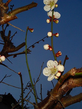 ■庭の白梅 撮影:SONY Cyber-shot T30 朝からスギ花粉症ばかりの日でした。今年は症状のひどい方が多いのです。痒みや充血、流涙ばかりではありません。白目がむくみ、瞼裂よりはみ出すほどになり、瞼が赤く腫れ上がることもあるようなのです。こちらの山には、まだまだスギの花粉がたくさんプールされています。しばらくは、晴れて風が吹けば、忙しいなー、きっと。本日帰宅してから庭の白梅を見ると、満開でした。これは実を採るための梅ですので、枝振りがよくありません。しかし花はやっぱり梅です。夕暮れ時でしたのでフラッシュを焚いてマクロモードで撮りました。ちらっと花札の構図を意識したりしてね。←クリックしていただけると嬉しいです。