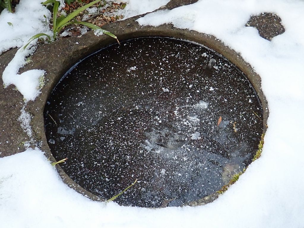 スコップを使って慎重に蹲の氷を割ろうとしましたが、硬いのなんのって!
