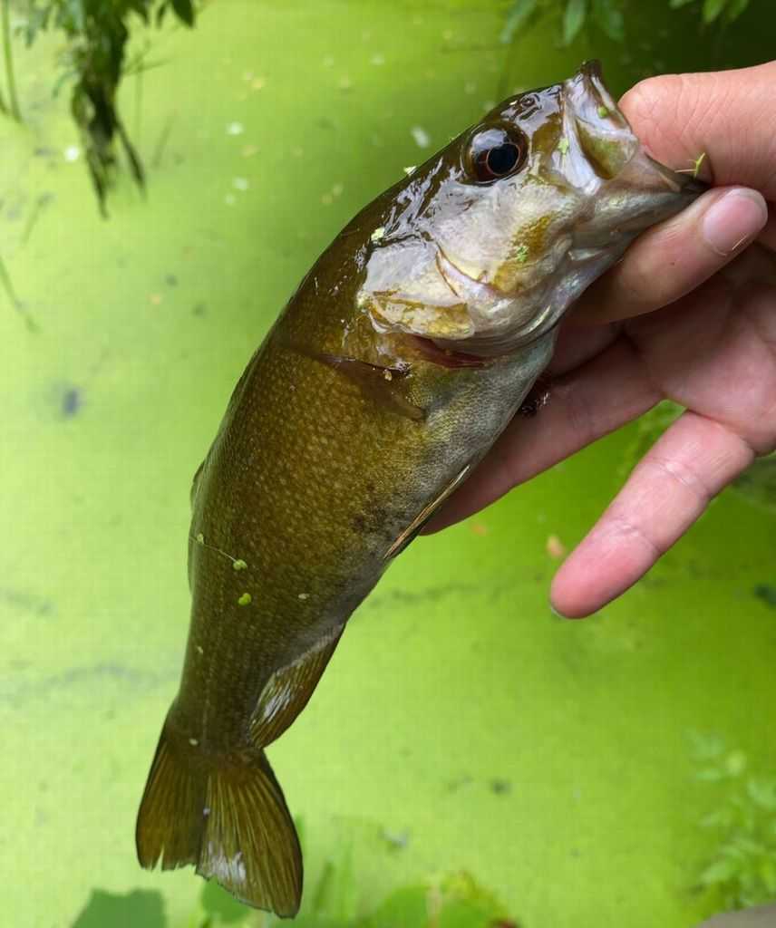 小さな沼・・・こんな緑に染まった水面の下にバスがいるの? いるのですね。それを蛙太郎は知っているからキャストする。