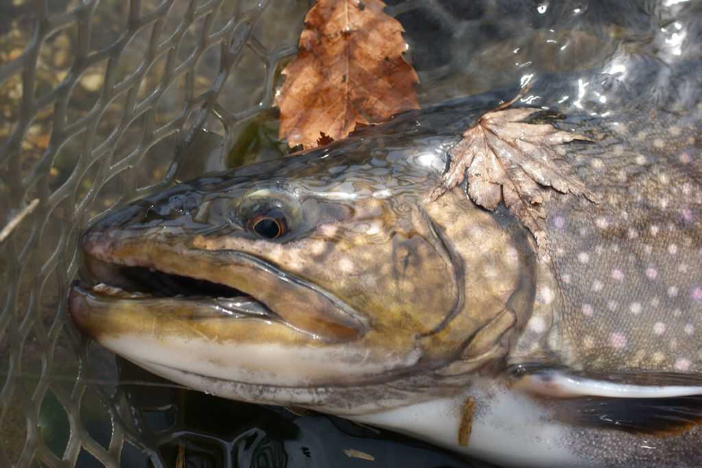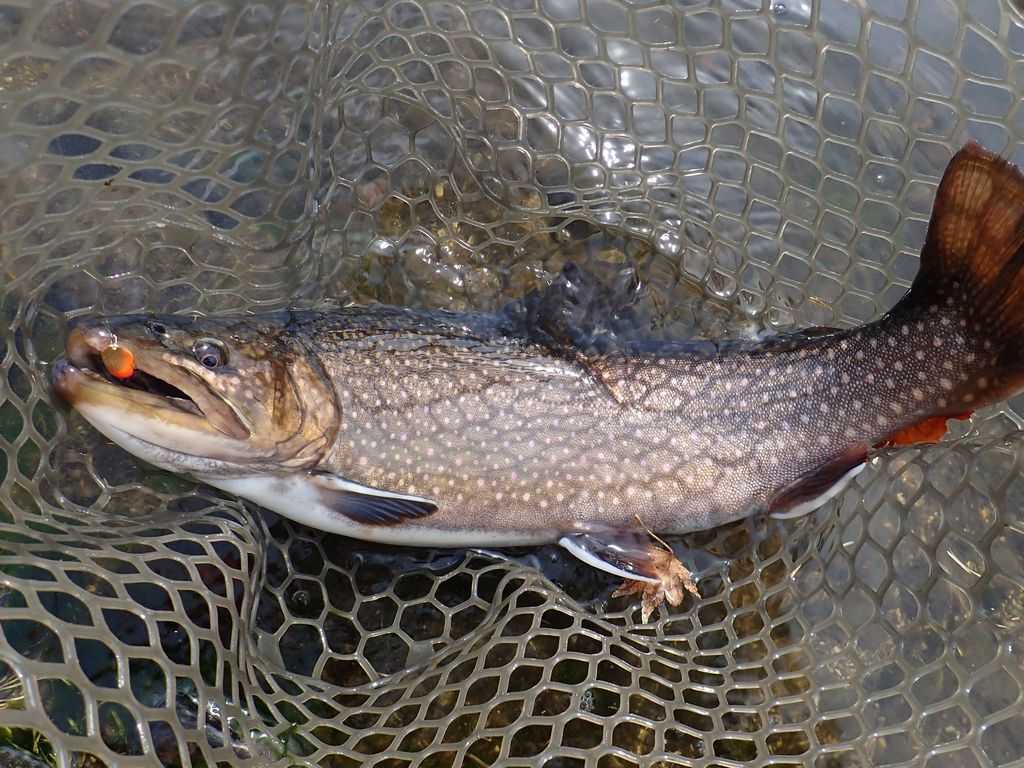 釣り上げたイワナは、全長が60cmは行ったかもしれないと思えるほど大きく見えましたので、ネットごと大雑把に測定してみました。