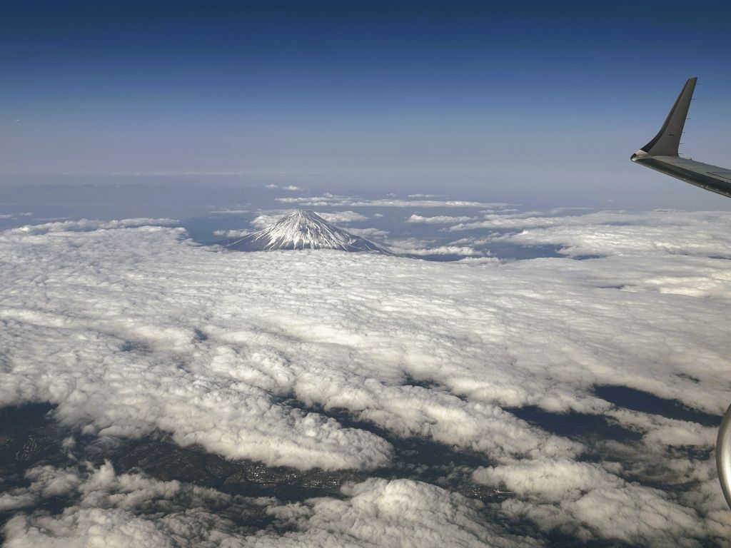 定刻から遅れて飛行機は羽田を発ちました。富士山が見えるかもしれないと思うと居眠りなんてしていられません。チラリチラリと窓の外を眺めていると・・・