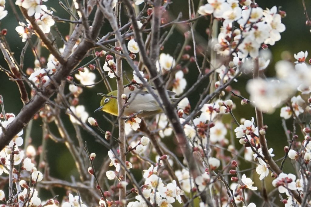 白梅の木にはウグイスではなくてメジロがいました。鶯色の由来が混同されやすいのは、まさにこのためですね。