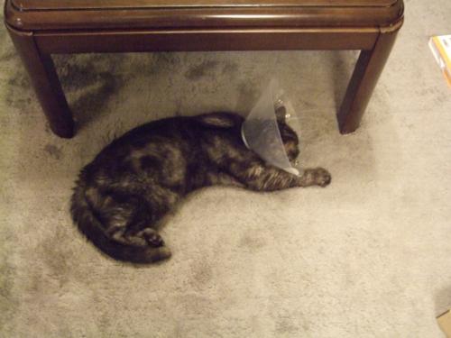 皆様お久しぶりです。久しぶりにブログにたどりつきました。るーさんはただいま顔面に潰瘍のようなかさぶたができています。でも生きています。私は気分の乱高下が激しくて、まだ頓服も睡眠剤もやめられません。ここ最近は特にパニック発作がでてこまります。ブログで知り合った方からブログで気持ちを吐露したほうがいいのではないかとアドバイスいただきました。そうですね。心の中だけで話していても頼りの自分が頼りないので解決しないばかりか、ますます弱ってしまうのです。ということで、またぼちぼちと書いてみようかと思います。るーさんはただいまエリザベスカラーをまいて治療中。病院でポリポリの試供品をもらいあげたところ、体にあうのか便がよくなってきました。それは離乳期用の猫ポリポリ。消化にやさしいので、胃腸がよわいるーさんにはちょうどいいようです。