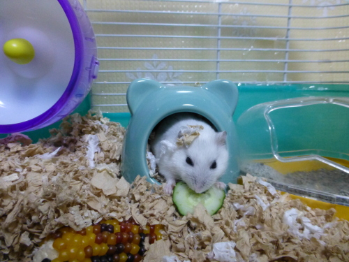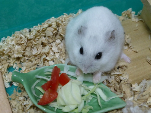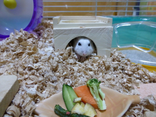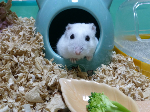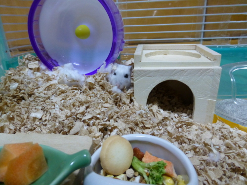 お久しぶりですゥ (*´▽`)ツ 毎日 蒸し暑いですねェ (; ̄ー ̄A アセアセ・ それに お天気も なんだか 急に 悪くなったりの 不安定な感じ・・・嫌ですねェ こんな 天気だと 体調崩しちゃいますよね( ̄∇ ̄;) みなさま 体調崩さないように 気をつけてね(*・∀<*) さて はなちゃんは・・・ 私が ごそごそ 床材を 整えてると 2階から 降りてきて 様子を 見てます (●´▽`)可愛いなー 今日は ミックスベジタブルと ブロッコリーだョー ・・・っと 置くと すぐに お皿に 飛びついちゃったぁー((*´∀`))ヶラヶラ あっという間に 頬袋が パンパンに すごい 勢いで 詰め込んでるゥw (゚∀゚lll)oO〇(スゲェ…) 好きなものを たんまり 頬袋に 入れて あとは ハウスの中で クシクシ そして 頬袋も すっきりして 可愛い お顔を 見せてくれちゃってますゥ 今日も 食欲 モリモリの はなちゃんでーす それと・・・ 不定期での 更新で コメントの お返事が 遅くなったりして すみません ((_ _(-д- 。)ペコリ 今回から コメント欄の 設定を 変更させていただきました また コメント欄 復活するかもしれませんが 今のところ コメント欄なしで よろしく お願いします(*´∀`*)ゞ よかったら 応援ボタンを ポチッと 押してくれたら とっても 嬉しいです ☆.。.:*(嬉´Д`嬉).。.:*☆ 今日は 最後まで 読んでくれて ありがとうです 不定期での マイペース ブログ更新になりますが よろしく お願いしま~す 応援 ボタンを ポチ ポチっと 押して くれると 嬉しいでチュ 最後まで 読んでくれて ありがとうです m(_ _)m