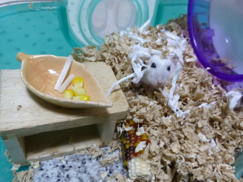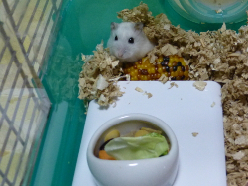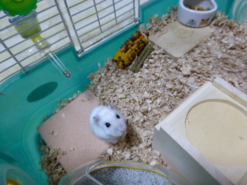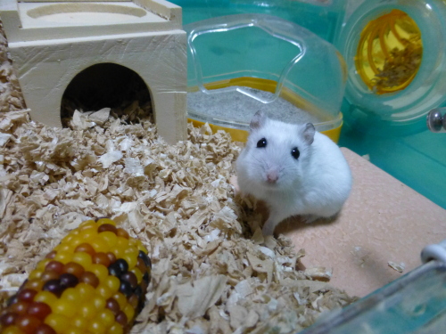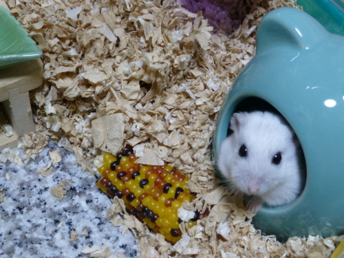 今日は 子供の 担任の先生が お話しに うちに来る日 家庭訪問ですゥw だから ・・・ (。-人-。) 朝から 大忙しで お片づけ ・・・ ( ̄▽ ̄;) ただの 片付けでなく 乱雑になった物を 隠しながらの お片づけで バタバタの日でしたぁ (;^_^A ・・・ 片付け 苦手なんだよなぁー (; ̄ェ ̄) 最近 はなちゃんの ケージの お掃除も 簡単にして サボってたので 先生が 来た時に ケージが 臭ってないか めっちゃ 気になりだし 午前中だったけど 急遽 お掃除することに 「 お掃除 するんでチュかぁー 」 最近 よく ここから 顔を 出してくれて 可愛いんだけど なんだか いつも 同じ様な 写真に なっちゃうのが 気になるゥw ( ̄▽ ̄;) だいぶ 暖かくなったので 綿を 入れるか 悩んだけど ・・・ 明日から ちょっと 寒くなるって 天気予報で 言ってたので とりあえず 少し 入れてみたら はなちゃん 大喜び ワッサ ワサ やってるゥー ヾ(●´∀`●)ノ゛ 「 綿を 楽しそうに ワサワサ やってたら ・・・ 巨大コーン 発見でチュ 」 今日は 急な お掃除を 我慢してくれたので ご褒美に コーンでーす ヽ(*´∀`)ノ ちょっと ビビリながらも コーンに 近づいてるゥ( *´艸`)クスッ♪ 「 今日のは 大物でチュ 」 もう 夢中で 齧ってましたぁ (* ̄▽ ̄*)アハハ カジカジ はなちゃん でーす 今日は 家庭訪問で 私は 片付けで 忙しく はなちゃんは コーン かじかじで 忙しい 一日でしたぁ 現在 人気ブログランキングと にほんブログ村に ランキング登録しています よかったら 2つ ポチ ポチっと 応援を よろしく お願いいたしま~すヾ(●´∀`●)ノ゛