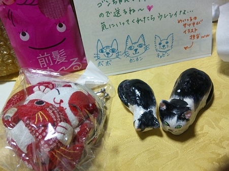 年の瀬に、素敵なプレゼントが届きましたー(*´∀`) ★ねこひげスタンド★ ほっぺに穴が開けてあって そこに、にゃんこのヒゲを刺す陶器です。 それぞれ、ゴンちゃん桜ちゃんの柄になっています。 世界にひとつだけな贈物だなんて ホントにありがたいです。 Gaviちゃん&Gavi主おねえちゃん 超超ありがとう~~~ヽ(*゜∀゜)ノ ♪Gaviちゃんのブログ ↓↓↓ 『キャンプ猫Gavi』 http://gavi0318.blog46.fc2.com/ ◆ねこひげスタンド日記 http://ameblo.jp/nekohige-sutando/