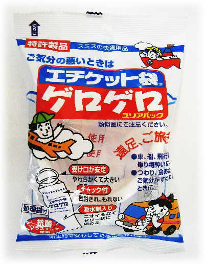 とってもストレートなネーミングに感心してしまう。(^^; ・受け口が安定 やわらかくて大きい ・チャック付き 密封され、もれもない ・吸水剤入り ニオイもなくゼリー状に固める ・抗菌プラスチック使用 2980円以上で送料無料とはいえ、260円だと12個も買わなきゃ送料無料にならないですねぇ。12個もなんて、よほど乗り物酔いしやすい人か、つわりがひどい妊婦さんくらいでしょうか。ご気分の悪い時は!!エチケット袋 ゲロゲロ ユリアパック 処理袋付き 1個