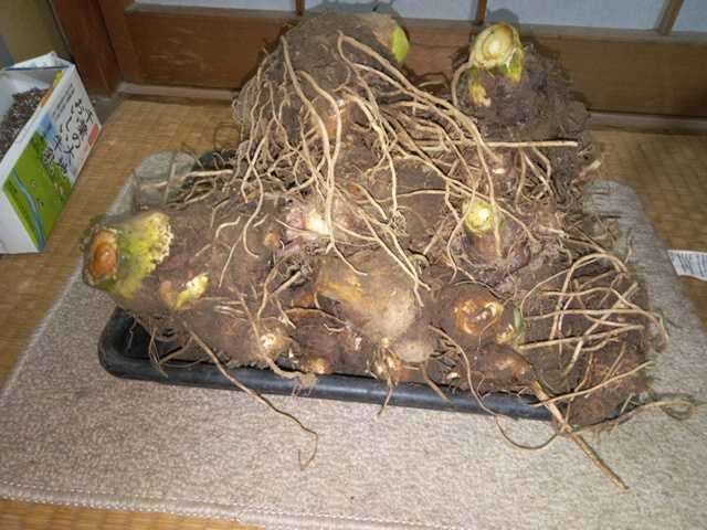 こんにちは。今日は晴れです。今日は○ごぼう○です。△ごぼう△実家から借りている畑でゴボウを収穫しました。勝手に種を飛ばして広がるごぼうです。滝野川ごぼうのはずですが、あいまいです。種をつけるとごぼう自体は枯れてしまいます。大きい葉のものだけを収穫するとエンドレス栽培ができますね。△ごぼう△とても太いゴボウです。太いものは腕の太さぐらいあります。深くまで掘れないので途中で折れてしまいます。でも先端は堅いので美味しいところだけ収穫できれば問題なしです。△ヤーコン△ヤーコンは1年育てて収穫しました。葉が大きくとても場所を取るのであまり増やせませんね。かじってみましたが生食だとほんのり甘くて梨のような感覚です。ダリアの球根みたいな球根でサツマイモにも似ています。菊科で南米アンデス原産らしいです。腸内環境を整え血糖値上昇を抑えポリフェノールが老化防止や生活習慣病を予防するらしいです。2株掘りましたが4kgくらいは採れたかな。球根を収穫して茎の根の部分を植えるとまた収穫できます。エンドレス栽培可能な優秀な野菜です。でも肥沃な土でないと収量は増えませんね。またイノシシに網を破られ畑を荒らされてしまいました。網設置を急がないといけませんね。今日の日本株はお休みです。今日の予報は最高気温15℃、最低気温7℃です。今日もつたないブログに来ていただきありがとうございました。「花、ガーデニング」「菜園」部門に登録しています。ガーデニング初心者ランキング家庭菜園ランキングにほんブログ村↑一日1回クリックして戴けると嬉しいです。家庭菜園ゴボウヤーコン