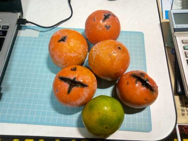 こんにちは。今日は雨です。今日は○柿とみかん○です。△柿とミカン△雨の中、庭の柿とミカン1個を収穫しました。ミカンは試し採りです。柿は禅寺丸という品種です。この柿は不完全甘柿で、多少渋が抜けないこともあるようで妻からは不評です。大きいのに罰点のような亀裂が入るし、ゴマの入っていないところは渋いそうです。何しろ鎌倉時代に発見された甘柿ですから仕方ないですね。ミカンは柿木の側にあるので黄色く色づいたものを採ったら半分腐っていました。それで味見を兼ねて多少黄色が買ったものを採り食べました。多少、甘みが少なくなっていますが味の濃い良いミカンです。大きさはまずまずで、今年はカメムシの被害が少なくて良いミカンが収穫できそうです。やはり温州早生ミカンは甘酸っぱいのが魅力ですよね。今日は一日雨です。良く雨が降るなと感心しています。おかげさまで畑に入れないので農作業は進まないです。午後は娘の病院で薬をもらってきました。今日の日本株はPF511千円(前日比-1千円)でした今日の取引はありませんでした。今日、M証券に追加の1000万円を振り込みました。出光興産とKPPを各4000株売却して合計1600万円分の投資信託を買います。手数料が高いのでほとんどが購入後ホールドになってしまいます。この打開策のつもりです。今日の予報は最高気温17℃、最低気温13℃です。昨日よりは1℃上がりましたが寒いです。今日もつたないブログに来ていただきありがとうございました。「花、ガーデニング」「菜園」部門に登録しています。ガーデニング初心者ランキング家庭菜園ランキングにほんブログ村↑一日1回クリックして戴けると嬉しいです。家庭果樹柿禅寺丸ミカン温州早生
