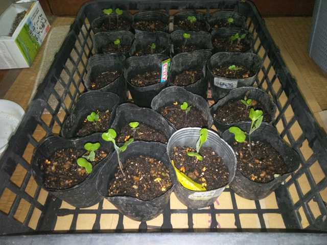 こんにちは。今日は曇り時々雨です。今日は○キャベツ○です。△キャベツ△10月初旬に蒔いたキャベツです。品種は春キャベツの富士早生です。ようやく本葉が出てきました。発芽の遅いものはまだ双葉です。温度が低いと成長が緩慢になるので少し早めに蒔くのが適切ですね。もう少しは薬にも蒔いたのですが虫にやられてしまいました。今回は雨が多く、胚軸が伸びてしまっています。△今日の収獲△今日の収獲はナスとオクラがちょっとです。昨日にいっぱい採ったのでこんなものですね。今日はネギに鶏糞を振りました。雨なので土寄せはできませんでした。順調に大きくなっています。今日の日本株はPF503千円(前日比-1千円)でした今日の取引はありませんでした。今日の予報は最高気温20℃、最低気温16℃です。秋本番の気温になってきました。今日もつたないブログに来ていただきありがとうございました。「花、ガーデニング」「菜園」部門に登録しています。ガーデニング初心者ランキング家庭菜園ランキングにほんブログ村↑一日1回クリックして戴けると嬉しいです。花キャベツ今日の収穫
