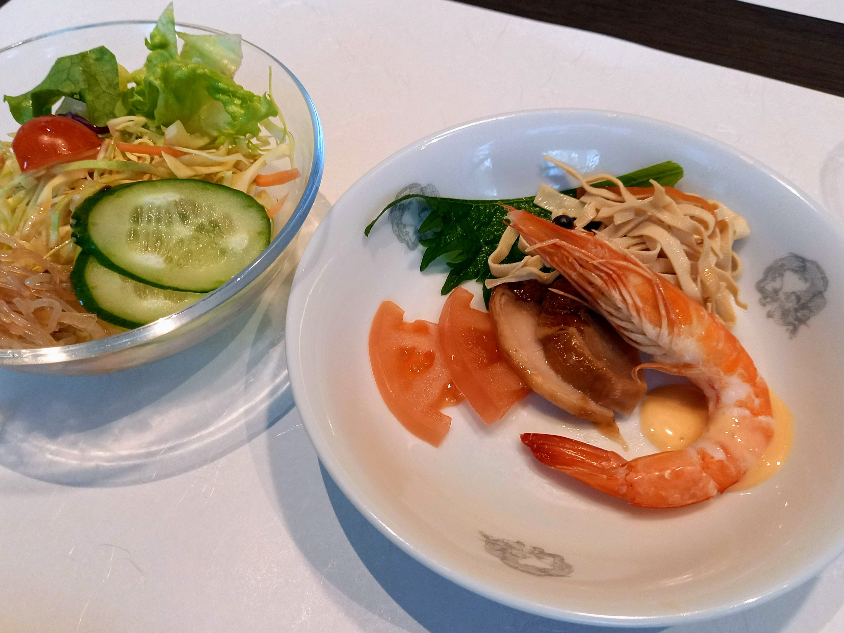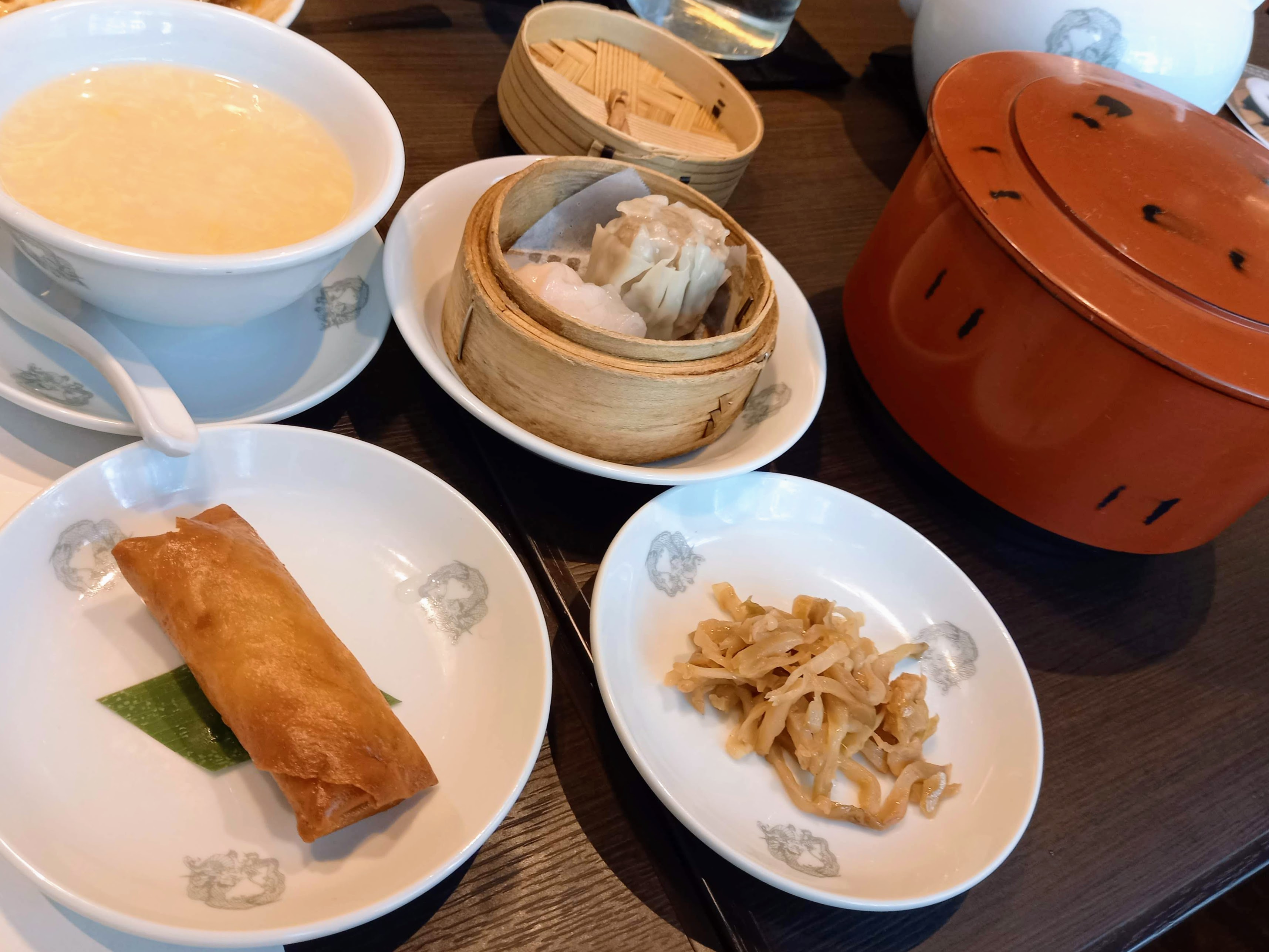 揚げ物(春巻き)、点心(肉焼売、エビ餃子)、コーンスープ、ザーサイ、ご飯。