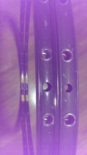 リフレックスと並び自分が自転車を始めた頃のマヴィックの定番チューブラーリムGP4新旧でスペックが違うと聞いていて興味があったので新旧バージョン(二本とも32H)を入手し違いをメモ今回の二本ですぐにわかる違いはタイヤ貼り付け面の真ん中に筋があるかないかこの写真では右側の筋のある方はアールが浅く、筋のない方はアールが深く感じます。ラベルは二本ともさらに古いMAVIC赤ラベルではなくパッと見たところ違いなさそう。よく見るとボルトとワットの表記が違っています。びっくりしたのが重量タイヤ貼り付け面に筋のあるもの(650W表記)は408g(ちょっとセメントが残った状態での計測だったかな)筋のない方(650V表記)は502gリム単体で持つとすぐわかるほど違います。100g違って同じ商品といえるのでしょうか。。。自分が自転車を始めたころは、手組チューブラーはまだまだ多く、定番リムとして軽さのリフレックス、重いが頑丈なGP4と言われていたと記憶していますが、その頃はもう重いバージョンになっていたのでしょう。軽い方(古い方?)が400gそこそことは、こんなに軽いんだという感想。これなら使ってみても500gのチューブラーリムは凄く頑丈そうですが自分の体重ではさすがに使いたいとは思わない。。。実測したERDも違いました。筋のあるもの(650W表記)はリム内径609+ニップル突出し長4*2=617mm筋のない方(650V表記)はリム内径604+ニップル突出し長4.7*2=613.4mmいつもスポーク長計算でお世話になっているサイクルボックスのサイトにはリム参考寸法としてGP4(OLD) 616mmGP4(NEW) 610mmとの表記があります。自分の採寸とは少し違いますが新しい方がタイヤ貼り付け面のアールが深くなった分ERDが短くなっているようです。GP4でホイールを組む際は要注意。ボルトとワット表記違いが当てにならなければタイヤが貼ってある状態では見分けるのは不可能?実際に比べて違いを探すのも面白いものです。数値(スポーク長など)重量測定