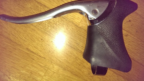 デュラエースのブレーキレバーBL-7402を手に入れました。左のみですが1000円以下左のみというのはちょっと頭にある構想(全然大したものではないですが)のためにはちょうど良かったかも。デュラエースのブレーキレバーというのは、実は15年前に入手出来ず当時残念に思っていたもの。自分が新品できちんとした自転車を買った1台目は約15年前のパナチタンその時、どういう自転車が欲しいかの一番の優先項目がフルデュラフレームは自転車のことをまだ何も知らなかったこともあり、特別こだわりはなく。ただ、「デュラエース」を使ってみたいというのがあったというのは記憶しています。パナチタンの前は、人に1000円で譲ってもらった宮田アルフレックスに乗っていたので、チェーンの動き、ハブの回転が重く、デュラエースならどれだけ滑らかに速く走れるんだろうと夢想していました。そして、フルデュラで揃えても安くあがるパナチタンを新車に選んだというのが経緯。「回転系が滑らかに」が自分の希望だったので(安くするためにも)STIとビンディングペダルは選択せずWレバー(シフトレバーはSL7700)&トゥークリップ(ペダルはSPD SL発売までずっと三ヵ島RX1)この選択の結果、自分が実業団ロードレーストップカテゴリーで最後のトゥークリップ使用ライダーに(多分)デュラエースで77系が出なかったスレッドヘッドバーツとシートピラーは74系に。同じく77系のラインアップがなかったブレーキレバーはお店の人に探してもらうも74系が手に入らず。仕方なくセカンドグレードのBL 6403をチョイスしたため、ブレーキレバーのみデュラでない仕様となっていました。なので、今回デュラエースのブレーキレバーBL7402の格安品と出会ってその事を思い出し、加えてランスがフロントWレバー仕様で走っていた時にこの左レバーを使っていたらしいということも自分には魅力だったので入手。Dura ace ロゴはプリントではなく刻印ランスがフロントWレバー仕様の時にブレーキレバー前面のロゴがこの「dura ace」でカッコいいなと見ていたのを思い出します(BL-6403のロゴは「shimano」だったので、当時はランス用の特注なのかななどとも思っていました。2000年ツールパンターニと共にオタカムを登るランスこの時はフロントWレバーのようです。シフトレバーはSL7700ではなく74系?ホイールはキネティックでなくキシリウムでしょうか。さて、重量測定123gBL6403は130gくらいだったので少し軽い。レバーの引きは軽く(77STI よりは全然軽いでしょう)、リターンスプリングによるレバーの戻りもとても滑らかでけっこう状態は良さそう。さあこのブレーキレバーをどう使うか。