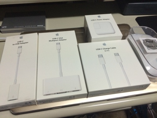 結局、電池の持ちのところで書いたけど、バスパワーの機器に給電してると充電の減りがハンパないので、純正のUSB−C VGA Multiportアダプタを使うことに。
