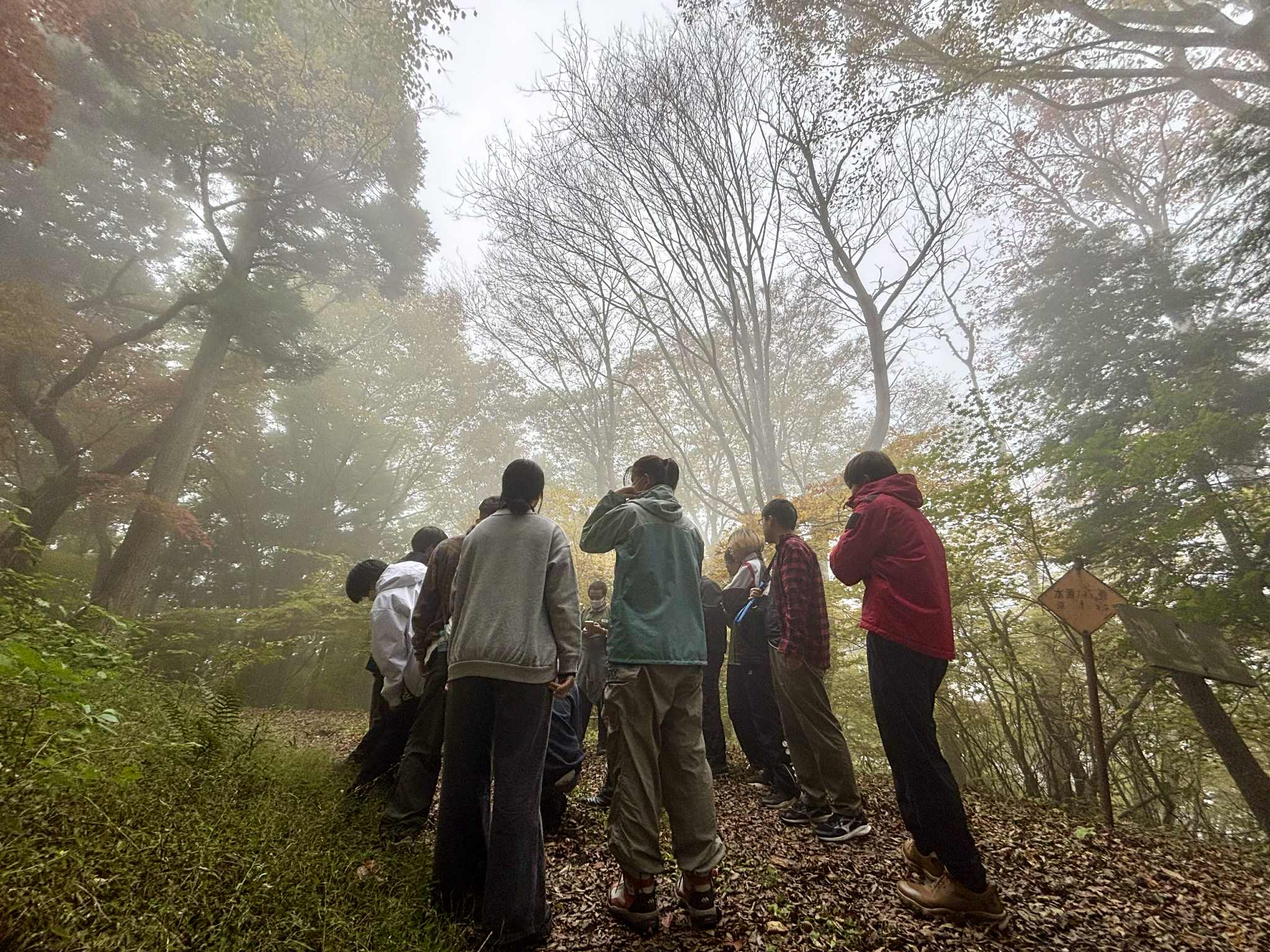 霧が立ち込める森の中を歩いた。霧の中と言うより、雲の中だったかも知れない。森林生態の実習で大川山の森に入った。標高1000mの森の中へ...。森の中は心地いい。森の空気を胸いっぱいに吸い込む。いつも人に話したくなる知識がいっぱい。 「へぇ~!」がいっぱいの授業をしてくださる。思ったほど寒くはない。残念ながら夜は雨予報なので、天体観望は明日にしよう。