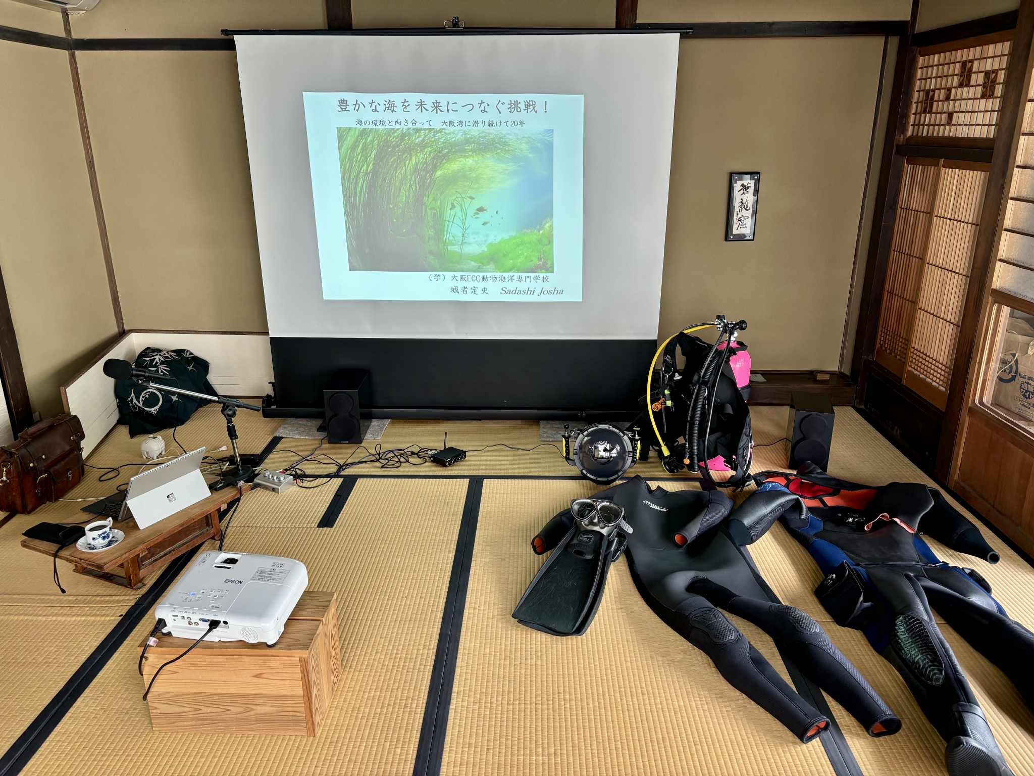 奈良・町家の芸術祭「はならぁと2025橿原・今井エリア」今年もサスティナブル講座に講師として声をかけていただいた。誠に光栄なことである。御座敷にダイビング器材は似合わない…(笑)人が横たわっているように見える。2020年から担当させていただいているので、今年で6回目になる。こういう機会をいただけるのは本当にありがたい。自分はこの場所に来るのが好きなんだな。「阿伽陀屋若林亭」