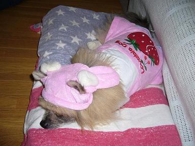 パイル地のパジャマ、ウサギ耳の帽子付きを着せました。この帽子には紐が付いていないのであっという間に脱ぎ去られます。(・_・;)イチゴのアップリケがなんとも、子供っぽくて可愛いです。