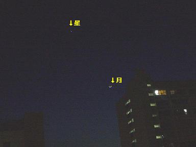 家から見た月と星の位置が微妙に気に入ったので写真を撮ったんだけど、暗いのでわかりにくい。。。けど、記念やし、残しておこうっと。6階から見た夜空でした。(*^.^*) エッヘッヘッ