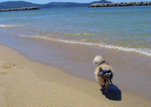 暑いので帽子かぶせました。なにせ、家からは車で10分位のこの海にチャリンコで30分位かけて来ました。(海に行ったのは、盆休みの初日の9日です。)