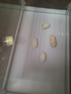 少し、ブログをお休みしているうちに・・秋、 いや~すっかり寒い季節になってました。少し鼻風邪気味です。さて、我が家のアイドルのクサガメさん、たぶん10歳くらい?黒化せずに大きくなるばかりなので、なんとなく雌かなとは思っていたのですが、初めて卵を産んだんですよ♪(8月15日のこと)冬眠させたことがないので、卵も産まないだろうと思っていたのですが、春に大きな水槽に移したのが良かったのかも。真っ白で綺麗な卵(私には輝いて見えます)を産みました。お腹に卵があると、食欲が減ると聞いていましたが、うちの場合全然そんなことなく、普段通り食べ動いていまして、朝起きてみると、卵が水槽の中に4つ沈んでいた・・・そんな感じでした^^今年は一回だけでしたが、来年は何回か産卵するのかな? 気をつけてあげようと思ってます。ニュースなどでカメが大きくなったら可愛くなくなるので捨ててしまう人が多い と・・意見をよくききますが、大きくなっても、とっても可愛いです。何故捨ててしまうのか分かりません。先月、両国に行く用事がありまして、巨大なカメの銅像を見つけました。上に乗っているのは徳川家康だそうです。踏みつけられて可哀想・・・台座が重そう。なぜ家康がカメに乗っている?ちょうど子供相撲のイベントがあったようで、両国の国技館の中にも入れました。わ~テレビで見た、国技館と同じ♪(当り前ですが)楽しく生きてます。