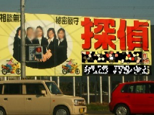 今日は日曜出勤の日だったんだけど思いっきり寝坊しました、、、9時出社の予定が起きたのが9時。仕事の打ち合わせの約束をしていたT氏からの電話で目が覚めまして、あの電話が無かったらさらに被害を拡大していたことでしょう。考えると恐ろしくなります。この場を借りてT氏、ゴメンなさいそして有難う、、、いや、なんせ今朝の5時くらいまでドップリ飲んでましたもんで。近所でも有数の無頼漢として名が通っている俺はまたもや無駄な男気を発揮してしまいました。いい加減大人の階段昇らないとね~、なんせもう30なんですから。っとゆうわけで諦めてのんびり会社に向かってる途中、家の近所で以前から気になっていた看板を激写してみました。探偵社の看板、、、 ってゆーかおもいっきり顔晒してるんですけど、、、秘密厳守ってゆうか、それでいいのかね?探偵の人って仕事に差し支えるとかでテレビに出る時とかも顔とか隠す人が多いと思うんスけど。どうなの?もうちょっとした有名人ですよ、俺の近くでこの人達目撃したら「オレの周りを嗅ぎまわってやがるな!」とか思っちゃうよねぇ。あ、でも女性にならちょっと嗅ぎまわられたいかも。(テヘッ)