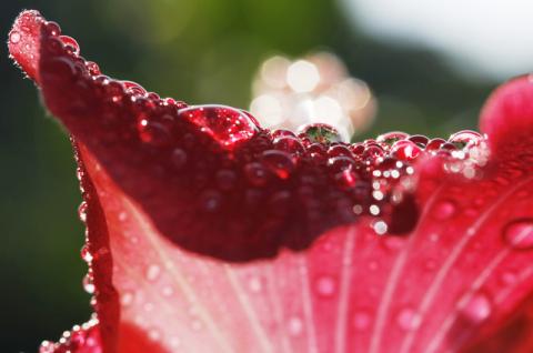 アカバナー沖縄では年がら年中咲いているのかな・・・ハイビスカスって言った方が本土の人には、分かり易いのでしょうね。きらきら雫に朝日をためて輝いていました。