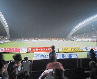 芝がとてもきれいでした。相手はジェフ千葉。オシム監督どこ~?巻はどこ~?さっぱりわかりませんでした。でもアビスパは弱いということがよくわかりました。3-1でジェフの快勝。チャンスを確実に決めていくところがさすがだなと思いました。アビスパは最後の最後で布部が決めてくれました。は~途中で帰らなくてよかった。息子も私も初めてのサッカー観戦にわくわくどきどきでした。今日はポケモンデーということでスタンプラリーなどあり、なぜサッカーとポケモンが関係あるのかよくわからなかったけど、息子は楽しんでました。入場者にピカチュウのサンバイザー(紙)くれたし。しかし、この色、ジェフの黄色と同じなので応援団がなるべくピカチュウはやめてくれというのではずしました。じゃあなんで配るの??応援はすごく盛り上がっていました。あの中に入ればストレス解消だろうなあ。たくさん応援歌がありましたがどんな歌詞なのかよくわからず・・・あ、途中でチャゲアスのモーニングムーンを歌っていました。替え歌かな。息子も応援団につられ、手拍子などで応援していました。ゲームはよくわかっていなかったけど、「あの18番いいね」とジェフの18番を指差していました。・・巻じゃん。楽しかったです!また行きたいな。